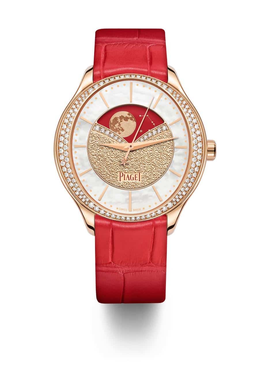 El rojo es el color asociado con el Año Nuevo chino gracias a su vínculo con la vida, la alegría, la riqueza y el coraje. El reloj funciona con el movimiento automático 584P de Piaget e indica las horas, minutos, segundos y fases de la luna. Se combina con una correa de piel de aligátor roja y una hebilla de oro rosa de 18 quilates. Limelight Stella estará disponible exclusivamente en China y Hong Kong a partir de febrero y en el resto del mundo a partir de abril.