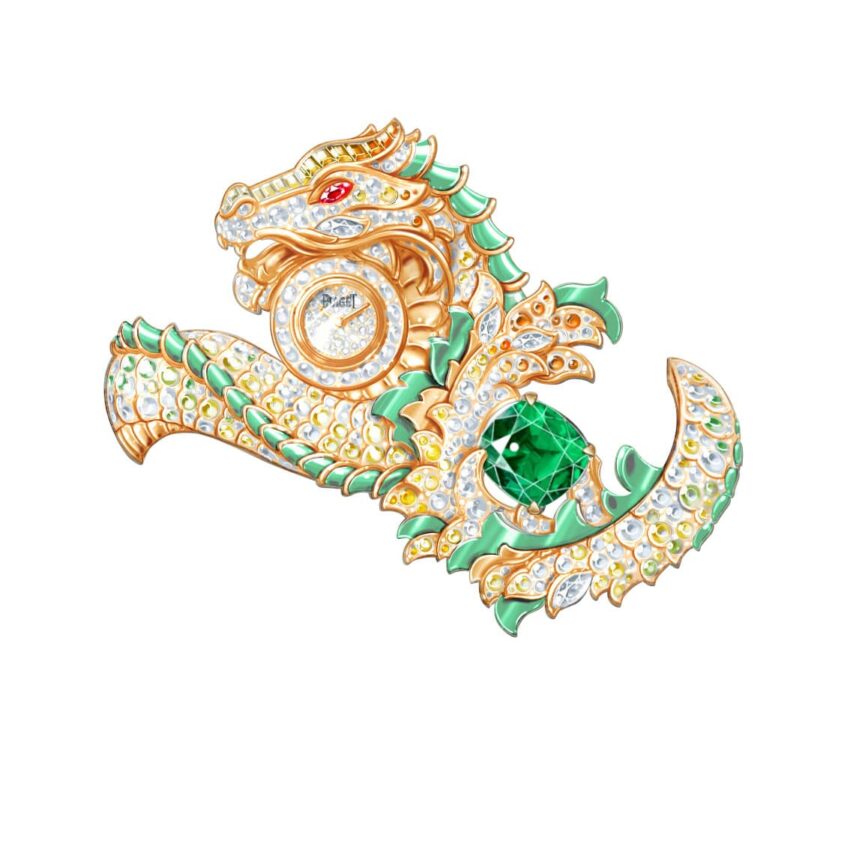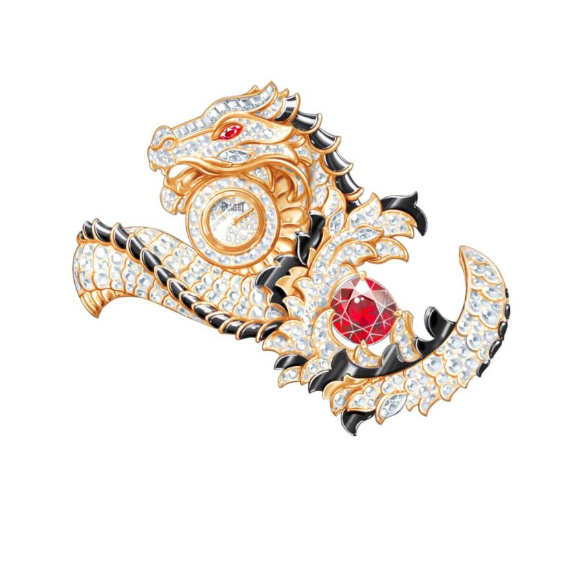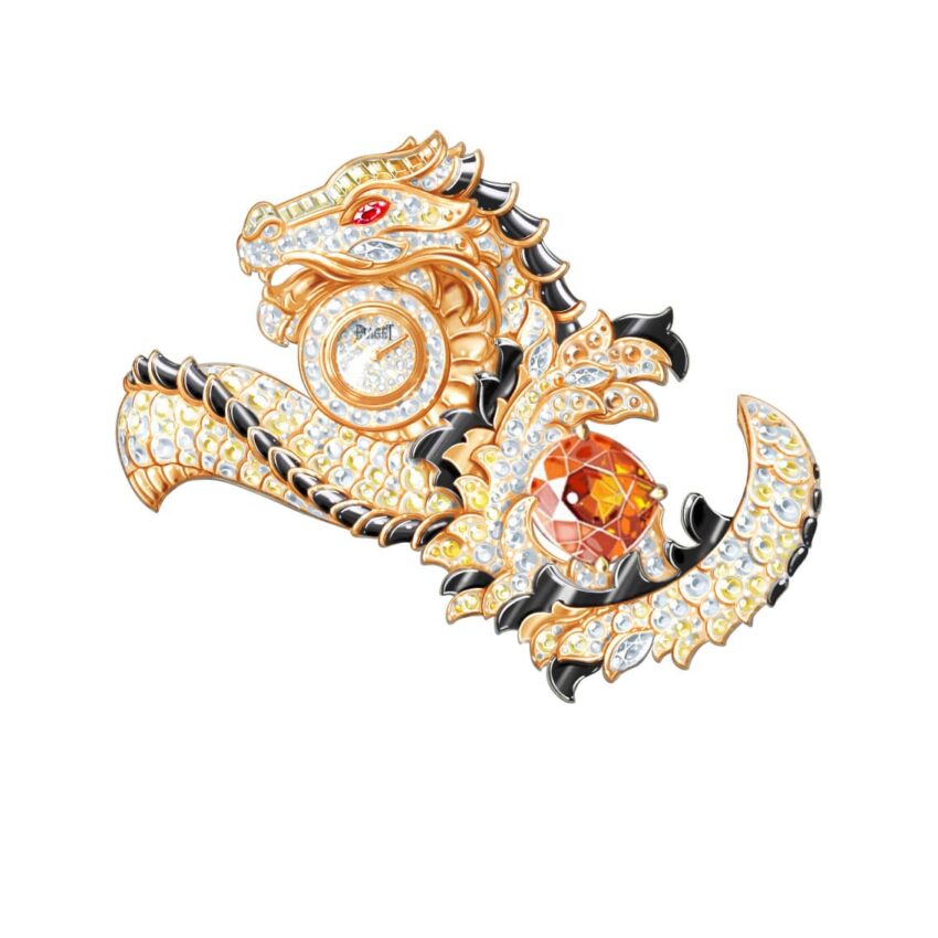 Cuatro nuevos relojes de Alta Joyería continúan el tema. En el reloj Altiplano High Jewellery Dragon de 41 mm, se aprecia el fino esmalte paillonné de Porchet en un dragón grabado en oro, que está representado con un exquisito y poderoso detalle. Con ojos rojos lacados y una mística bola de fuego de ópalo negro en sus garras, todo el diseño irradia un asombroso grabado de rayos de sol. Decorado con diamantes en las asas y el bisel, el reloj está animado por el histórico movimiento mecánico ultraplano Manufactura Piaget 830P, de cuerda manual, y está limitado a ocho ediciones numeradas.