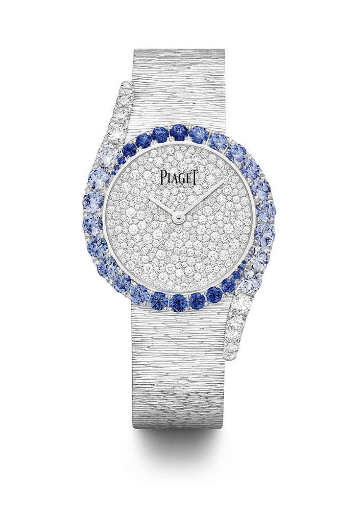 - Caja: 32 mm de oro blanco de 18 quilates; con engaste de 32 zafiros azules talla brillante y 10 diamantes talla brillante, fondo de cristal de zafiro