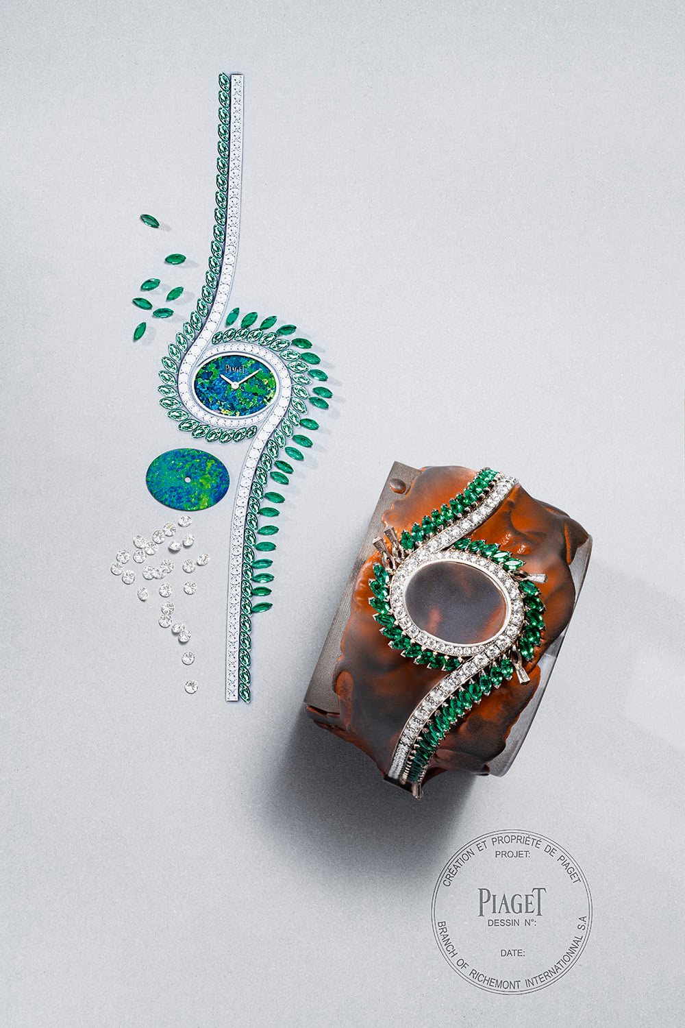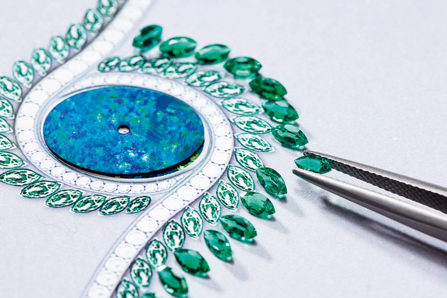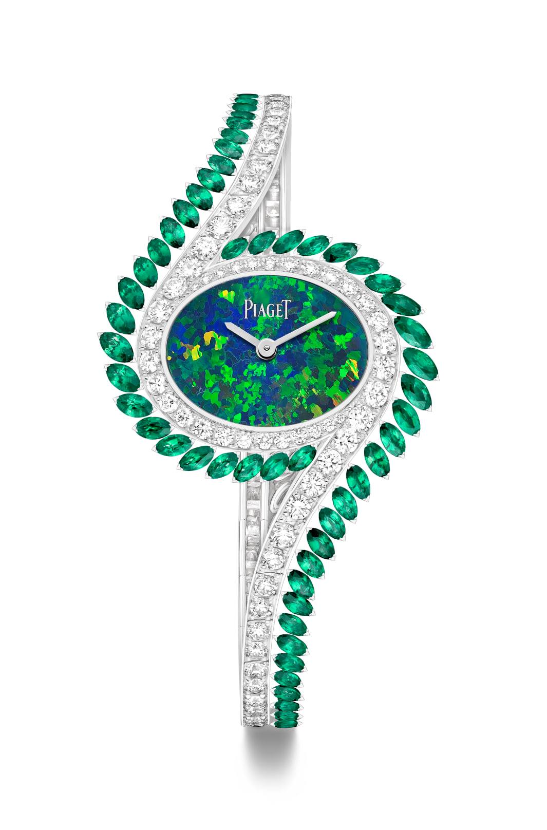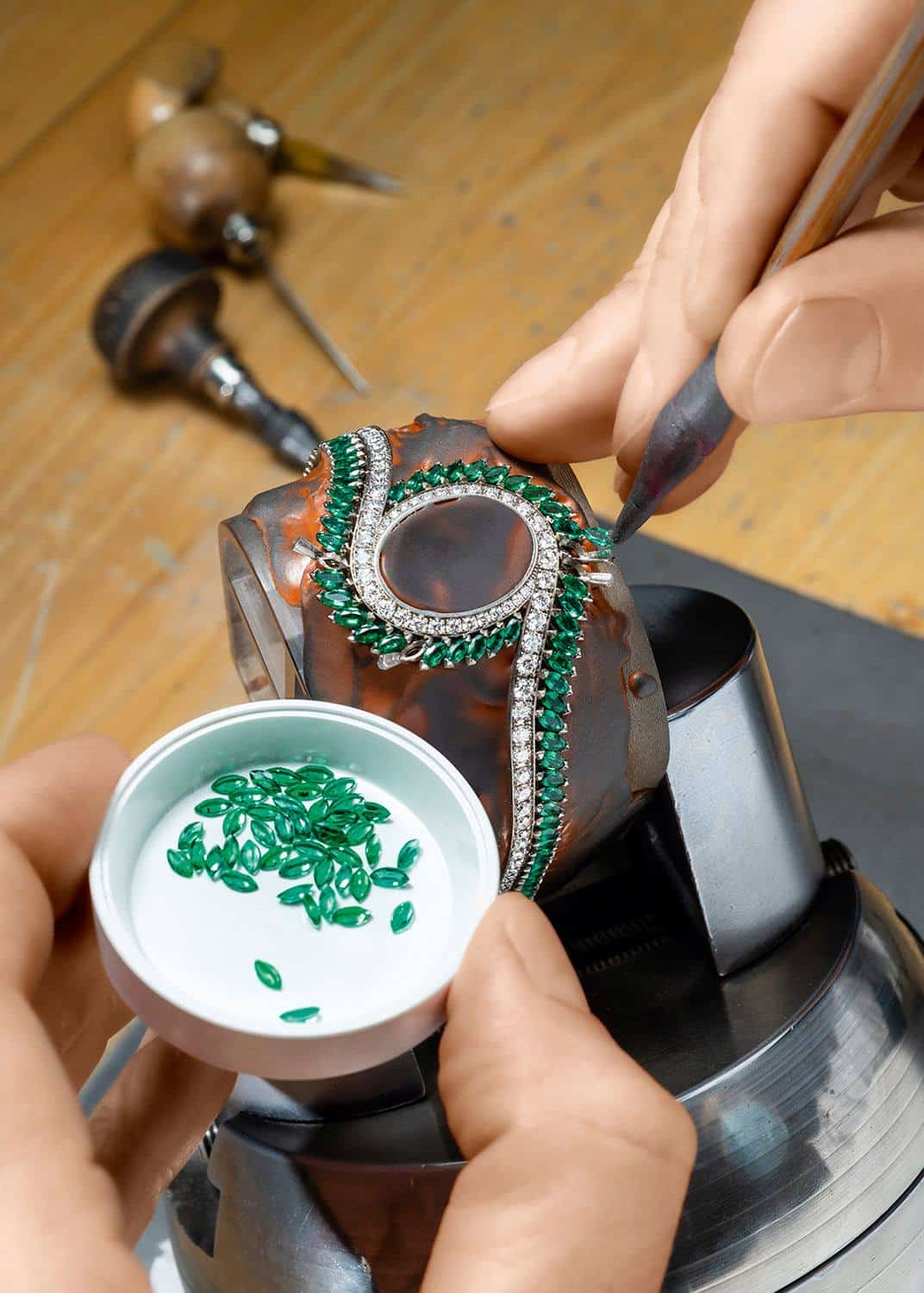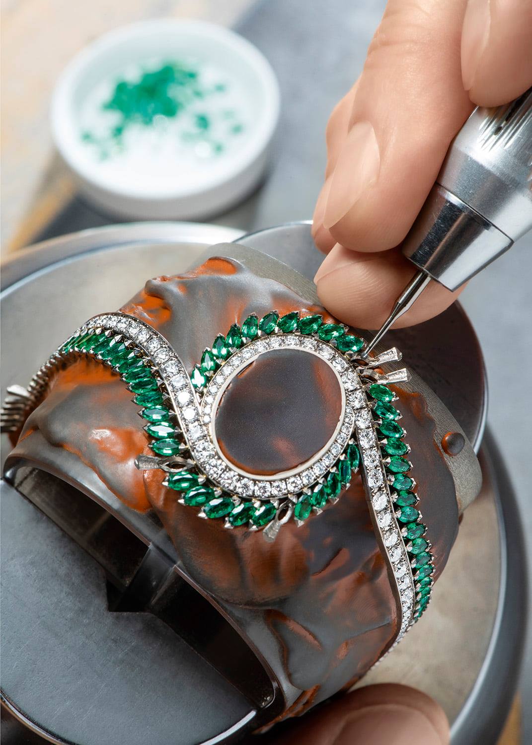 - Caja: 36 x 28 mm oro blanco de 18 quilates; bisel y cuernos engastados con 83 esmeraldas talla marquesa y una fila de 91 diamantes talla brillante 5.525 quilates