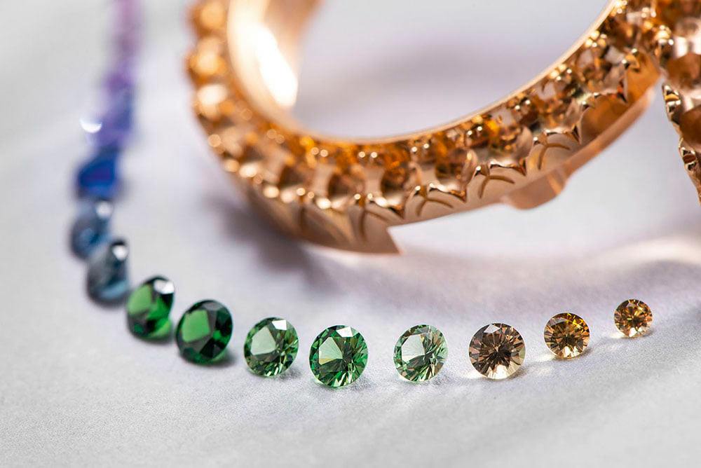 - Caja: 32 mm de diámetro en oro rosa de 18 quilates; bisel engastado con 5 tsavoritas verdes de talla brillante (aprox. 0.91 quilates) y 37 zafiros de talla brillante de colores que van del rojo al naranja, amarillo, azul, índigo y violeta (aprox. 7.90 quilates), fondo de cristal de zafiro