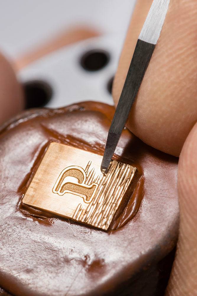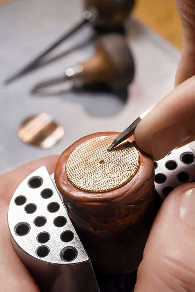 - Carátula: de oro rosa de 18 quilates grabada con decoración