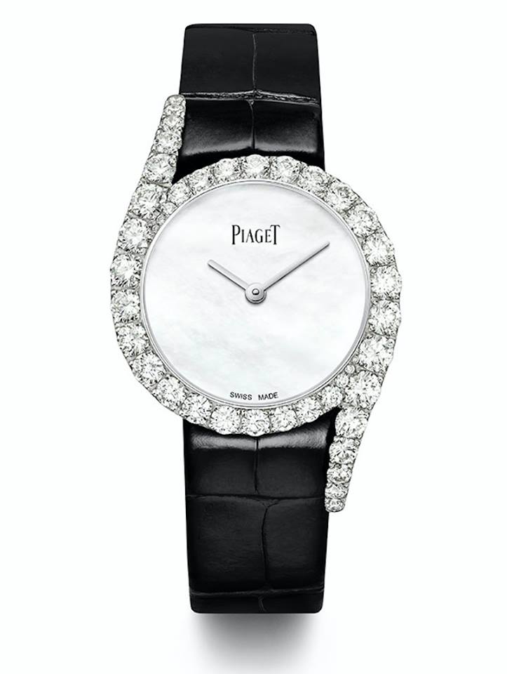 Una caja de oro blanco de 18 quilates engastada con 42 diamantes talla brillante, embellece la carátula de nácar en color blanco. A través de una pulsera en piel de aligátor negra con hebilla ardillón, este modelo representa la seriedad de una mujer tenaz y fuerte.