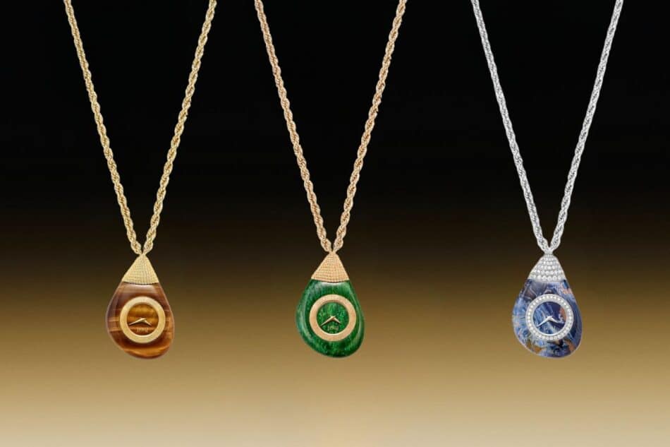 Para 2026, la Maison retoma ese ADN creativo con Swinging Pebbles, una reinterpretación fresca y táctil de los icónicos sautoirs. Cada reloj colgante está tallado a partir de una sola pieza de piedra ornamental –ojo de tigre, verdite o pietersita–, ahuecada con precisión para alojar un movimiento de manufactura.