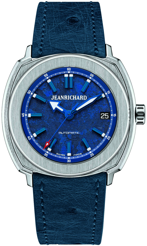 El primer modelo adopta las reducidas dimensiones del Terrascope a 39 mm, mientras que goza de una coloración azul texturizada para la carátula, igualmente cuenta con índices azules suspendidos y se abraza a la muñeca mediante una correa de legítima piel de avestruz con cierre desplegable en acero.