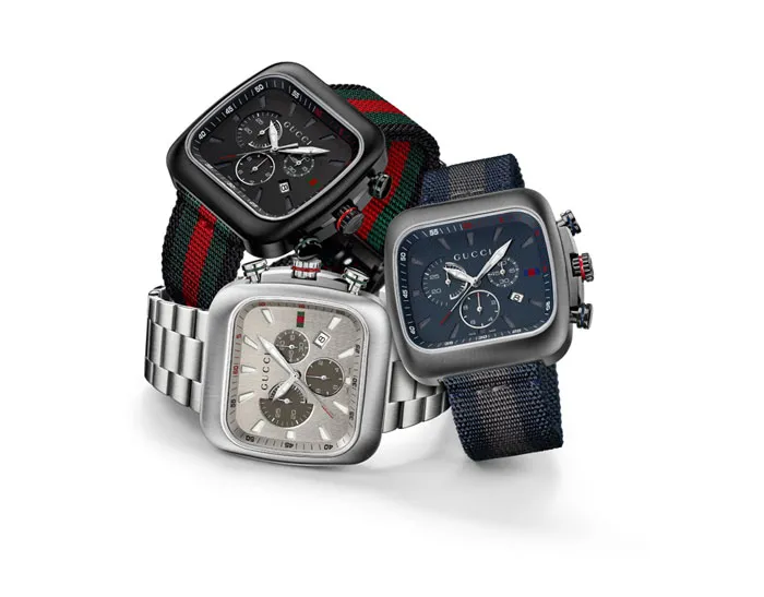 El cronógrafo de cuarzo Gucci Coupé en PVD negro, resulta el complemento perfecto para el irónico estampado bicolor de Gucci, motivo que se utiliza en la carátula y correa, mientras que la versión en azul marino hace juego con una caja de PVD gris satinado y una elegante carátula azul oscuro. Su correa de nailon presenta el distintivo estampado de rayas: azul-gris-azul de Gucci. Last but not least, la versión en color gris, incorpora un armis compuesto por eslabones de tres secciones, que representan la solidez y la masculinidad. En esta versión los tonos nítidos re revalorizan con el destello de color del estampado de rayas original de la firma, presente en la carátula.