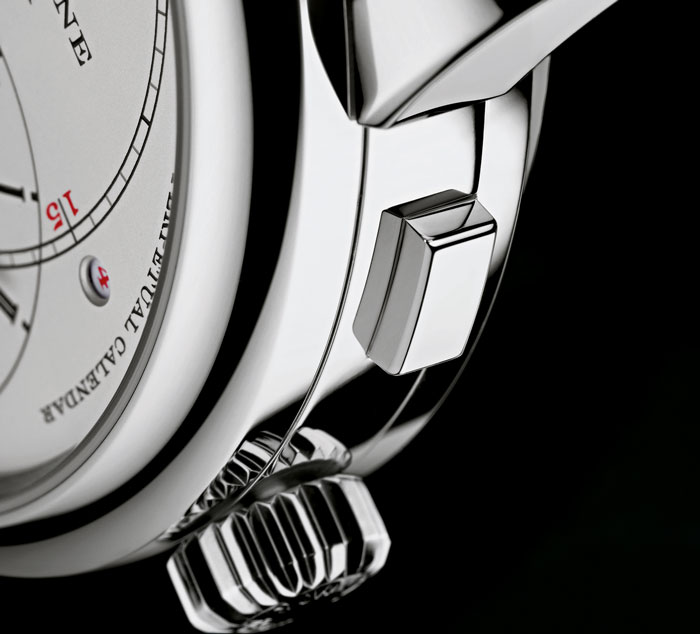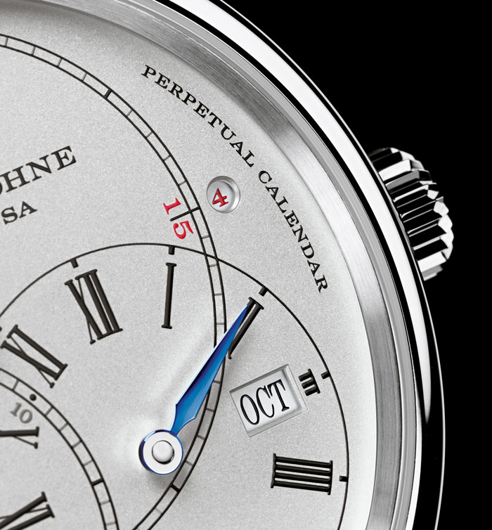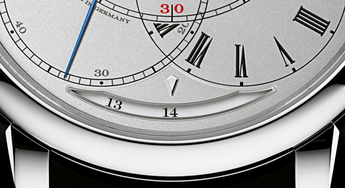 Finalmente hablamos de la parte frontal de una pieza que obedece al principio fundamental de A. Lange & Söhne, es decir, la legibilidad. Contar con mecanismos de micromecánica tan precisos puede ser sinónimo de una compleja lectura de sus indicadores, no obstante en “Lange” ningún detalle se pasa por alto y mediante la apertura de cuatro ventanas, indica la gran fecha (días y mes por dos pequeñas ventanas); una pequeña ventana redonda a la derecha, junto al 15 del círculo de los minutos, se encuentra la indicación del año bisiesto, que necesitará un solo ajuste en el año 2100. Las horas, minutos y segundos aparecen descentrados en configuración parecida a la de un reloj regulador: horas a la derecha, minutos al centro y segundos a la izquierda. Fácil de leer, pero todo un reto para la construcción, posible gracias a la manufactura de Sajonia.