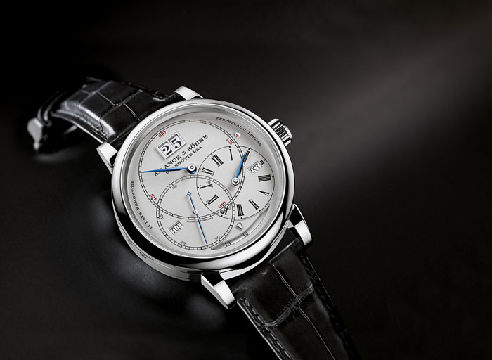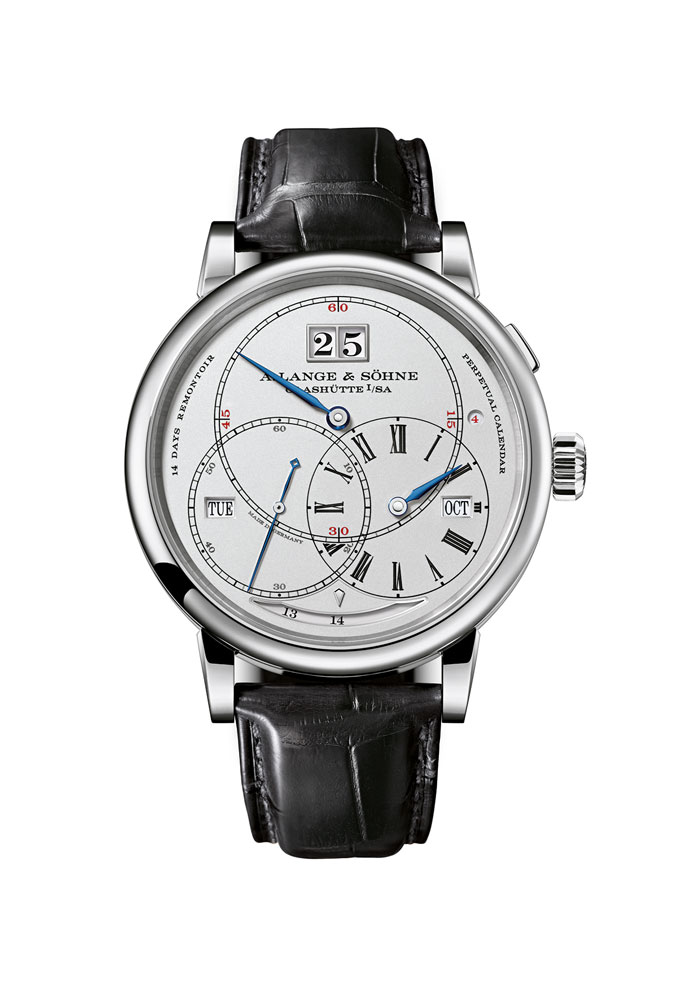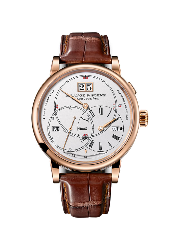 Richard Lange Calendario Perpetuo “Terraluna” // Movimiento: mecánico de cuerda manual / Calibre: L096.1 de manufactura, decorado y montado a mano; regulación en cinco posiciones, doble barrilete y mecanismo de reajuste de la tensión con resorte de cuerda intermedio de fabricación propia; platina tres cuardos de alpaca natural y puente del volante grabado a mano / No. de piezas: 787; joyas: 80 rubíes / Frecuencia: 21,600 a/h / Reserva de marcha: 14 días / Funciones: horas, minutos y segundos; calendario perpetuo con gran fechador, día de la semana, mes y año bisiesto; indicación de reserva de marcha; indicación orbital de las fases de la Luna día/noche al anverso / Caja: 45.5 mm de oro rojo o blanco de 18 quilates / Cristal: zafiro por ambos lados / Carátula: plata maciza / Correa: piel de cocodrilo cosida a mano color marrón / Hebilla: de oro rojo o blanco desplegable.
