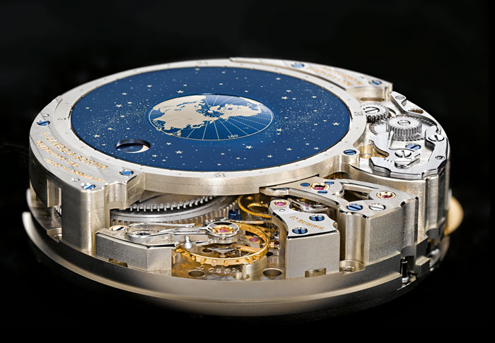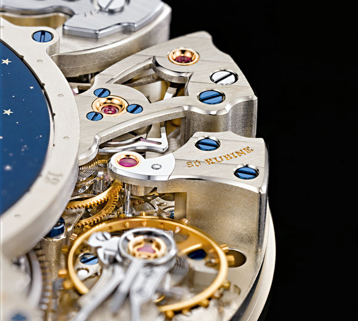 Una obra de arte de tal naturaleza debe contar con todos los elementos inherentes a esta definición, por lo que la concepción y legibilidad de la pieza deben formar parte del conjunto y obedecer al magistral trabajo de mecánica realizado en el calibre. Tres discos de oro blanco han sido utilizados para la indicación poética de las fases de la Luna, mientras que en su “cielo” han sido trazadas más de 1,200 estrellas, pero eso no es todo, el anverso del reloj exhibe la rueda de volante cuál si se tratara de la posición del Sol en forma real, lo que hará que el disco de las fases lunares camine de manera correcta con respecto a dicha posición, logrando con ello el trazo de una indicación día/noche, igualmente, si trazáramos con una regla una línea imaginaria con respecto al volante (Sol), podríamos conocer las horas de acuerdo a los husos horarios dados por el hombre y los organismos que ha creado para ello. Podemos mencionara –además– que el disco de la Luna gira en contrasentido a las agujas del reloj, lo que se refleja de forma exacta obedeciendo al periodo orbital sinódico de 29 días, 12 horas, 44 minutos y 3 segundos, a corregir una vez transcurridos 1,058 años.