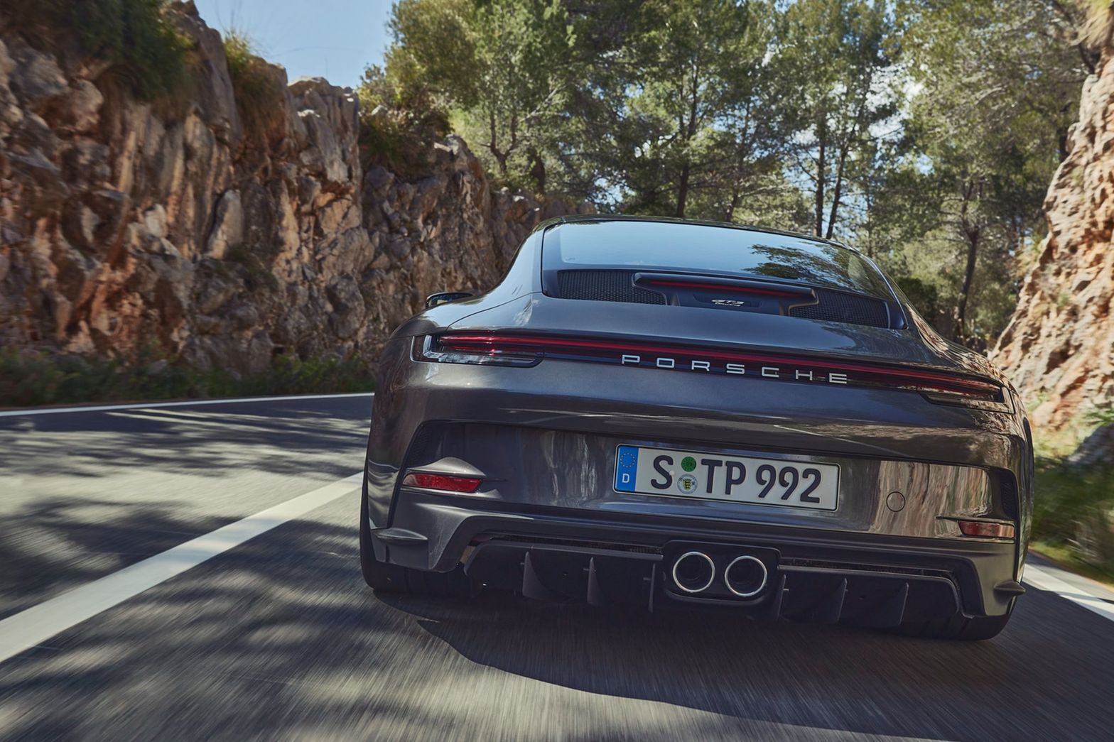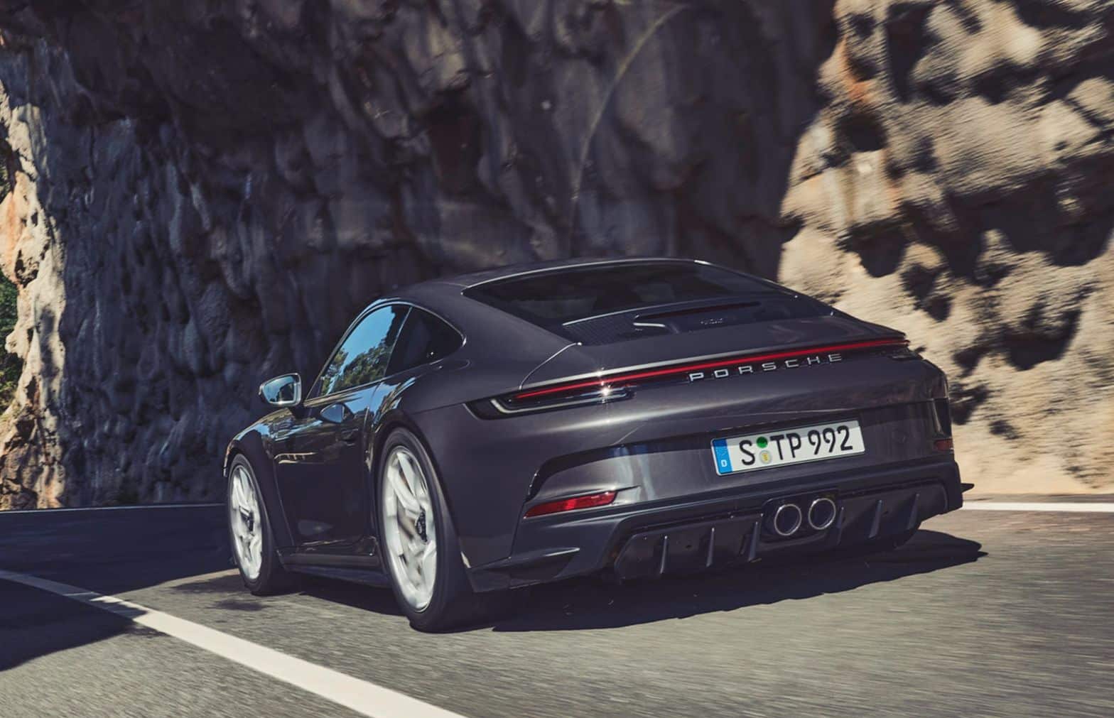Al igual que el GT3 Touring de la generación 991, el 992 es un GT3 sutil y discreto. Si bien comparte el motor, las transmisiones, la suspensión, los rines y los neumáticos del GT3 estándar, adopta un nuevo aspecto. El gigantesco alerón trasero ajustable se ha ido, reemplazado por un alerón trasero que se extiende automáticamente a altas velocidades. Obtiene un nuevo diseño de parrilla delantera y la fascia delantera está pintada en el color de la carrocería en lugar de contrastar en negro. Se quitan más molduras negras de las molduras de las ventanas y se reemplazan con aluminio brillante para una apariencia clásica. La ventilación agresiva del capó delantero permanece. Básicamente, este bólido tiene “mejores modales” como auto de uso habitual que el GT3 tradicional.