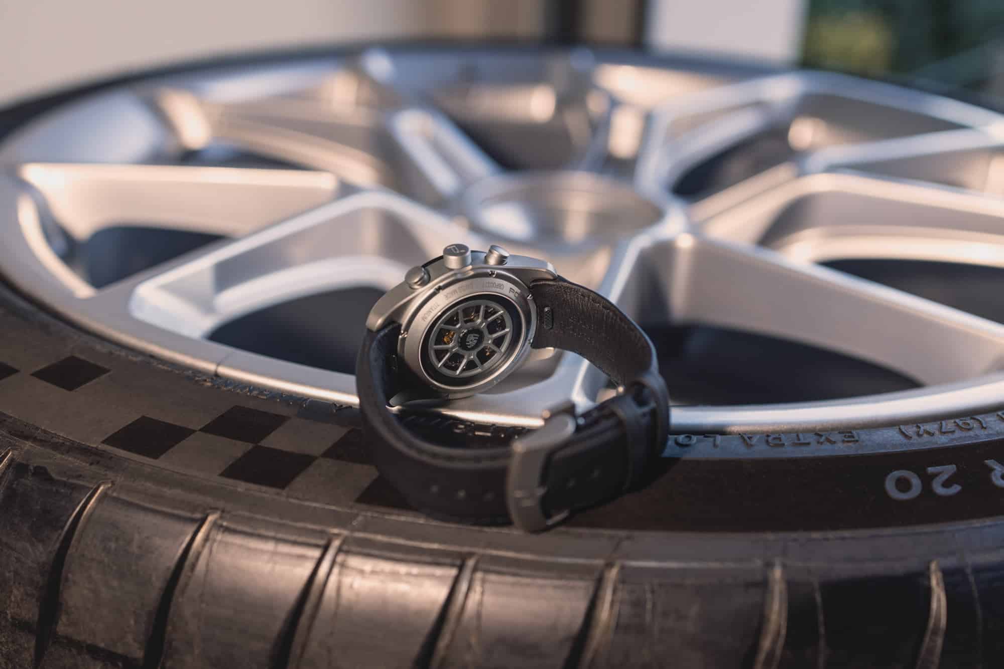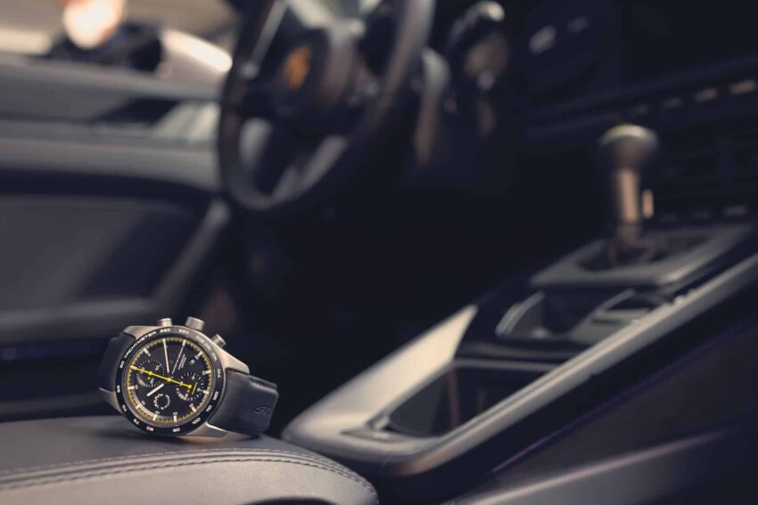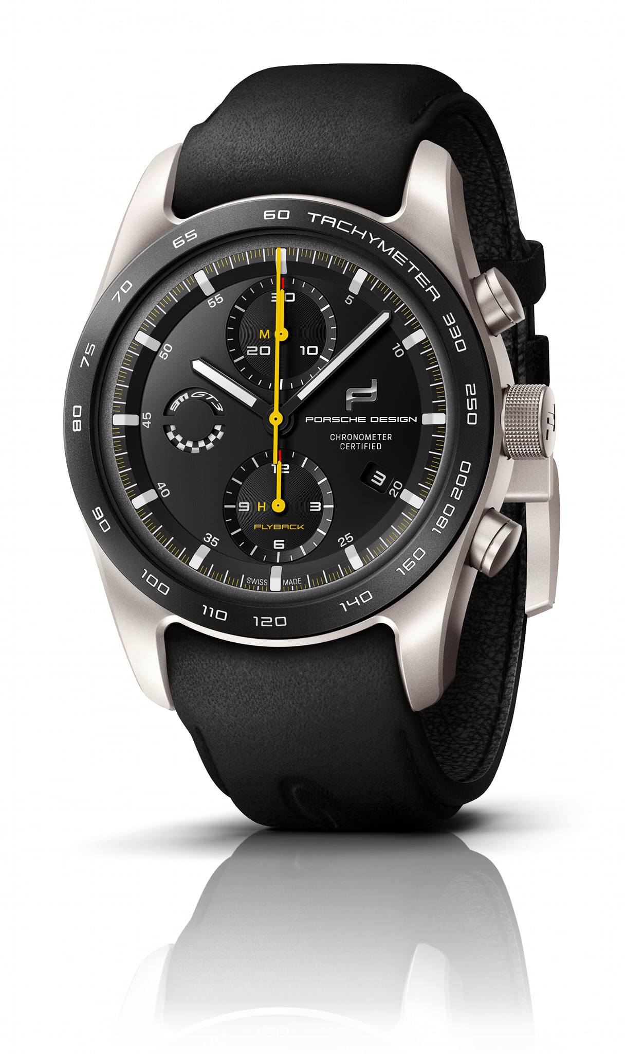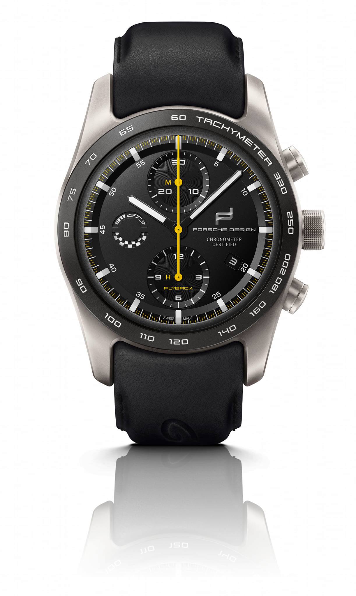 La caja de titanio natural pulido presenta una escala taquimétrica en el bisel. El color gris ágata metálico –presentado en la campaña de comunicación– es similar a la pintura del automóvil. El anillo exterior de la carátula es negro. Para un contraste máximo, las manecillas del cronógrafo son amarillas para coincidir con el cuentarrevoluciones en el grupo de instrumentos del automóvil; las otras manos son blancas. La carátula negra mate tiene un acabado con una pista de minutos en blanco y amarillo, contadores de cronógrafo empotrados a las 6 y a las 12 en punto y un indicador de funcionamiento a las 9 en punto. Por último, una ventana de fecha se coloca a las 4 en punto.