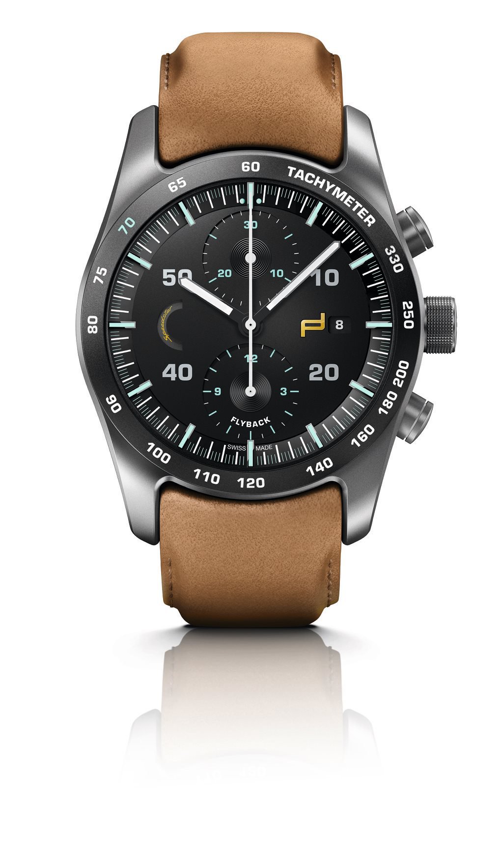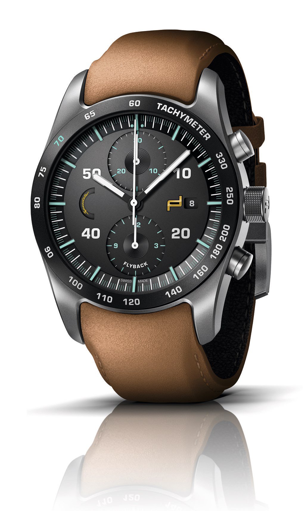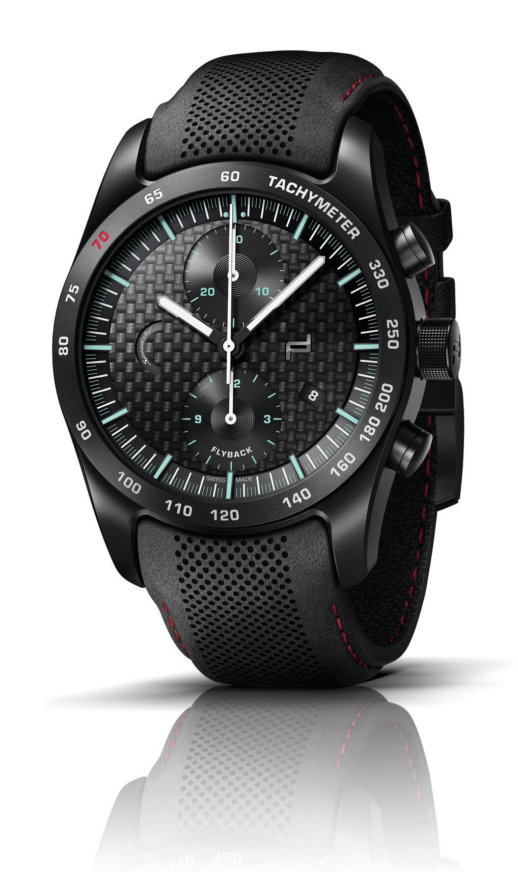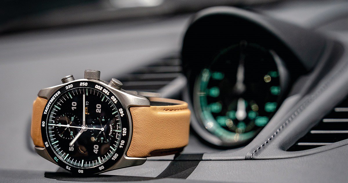 El nuevo Porsche Design Chronograph exhibe el espíritu histórico y vintage de los primeros Speedster 356, con caja de titanio ultraligera y esquema de automóviles del paquete Heritage. La carátula negra cambia y ya no es de fibra de carbón, pero negra mate y con numerales arábigos verdes y plateados. La caja es de titanio sin recubrimiento de carburo negro, mientras que un 70 destacado en color verde luce en el taquímetro y rinde homenaje a las 7 décadas de la marca automotriz. Finalmente, la piel de becerro es color cognac con despuntes en hilo del mismo color.