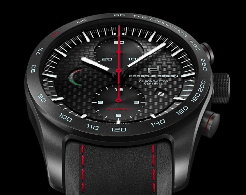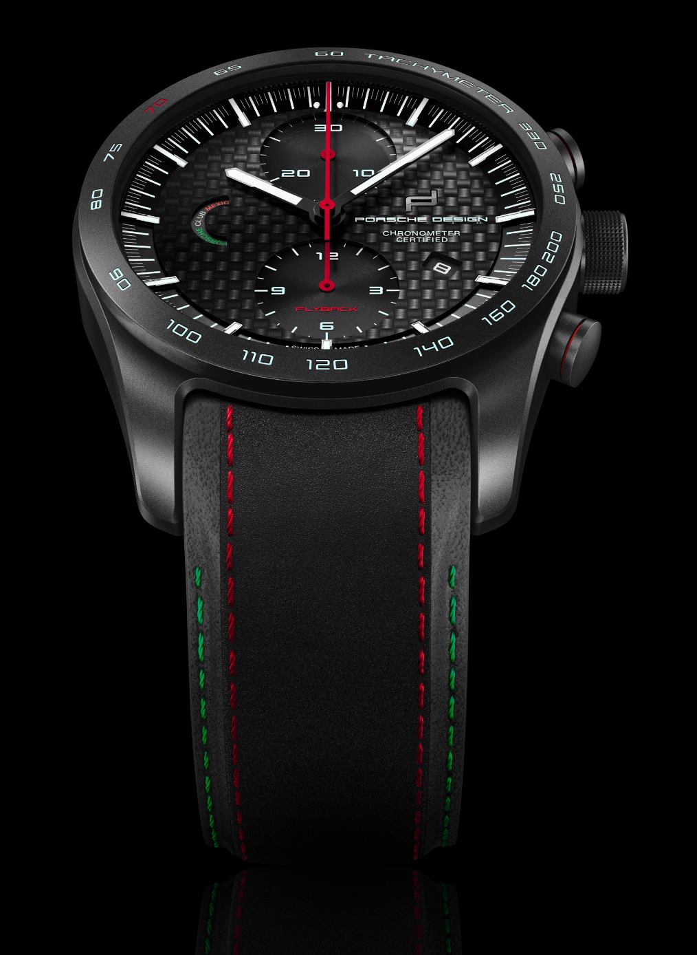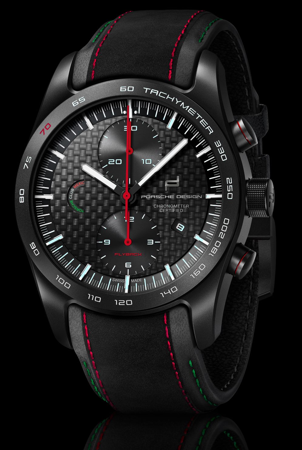 La caja de titanio ennegrecido se extiende hasta los 42 mm de diámetro, luce una carátula negra de fibra de carbono con contadores a las 12 (30 m) y a las 6 (12 horas). Una apertura a la altura de las 4 presenta la fecha, mientras que en punto de las 9 luce la inscripción tricolor Porsche Club México.