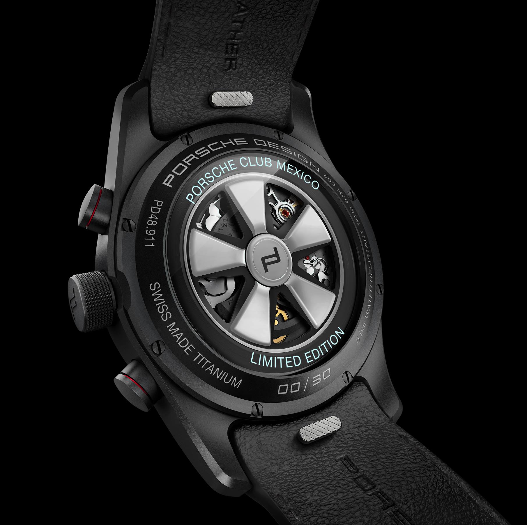 Tal como ha sucedido en las últimas piezas presentadas por la marca, Porsche Design incluye un detalle sumamente especial en el reverso de sus Ediciones Limitadas. En esta ocasión se optó por crear la alusión del emblemático rin Fuchsfelge, la icónica rueda de los Porsche de hace 50 años, que se observa gracias a un fondo de cristal de zafiro. Este detalle es totalmente funcional y utiliza contrapesos para fungir como rotor de carga automática, brindando con ello la energía a la pieza tal como lo hace un rin en colaboración con el tren motriz, brindando sostén para el movimiento de un auto.