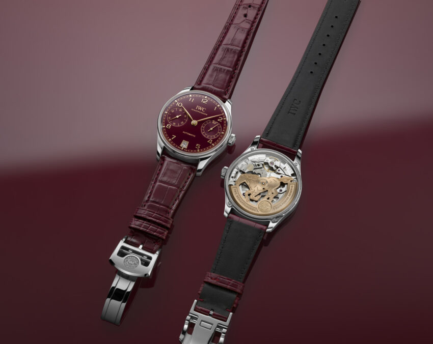 Sobre su carátula rojo borgoña, una referencia a los tonos rojos empleados en las celebraciones del año nuevo lunar, que ahuyentan la mala fortuna y atraen la prosperidad, se hallan las manecillas doradas, los numerales arábigos y los apliques que, con las subcarátulas de los segundos pequeños a las nueve y de reserva de marcha a las tres, recuerdan el primer Portugieser Automatic (Ref. 5000) del año 2000, sumando una discreta ventanilla de fecha a las seis.
