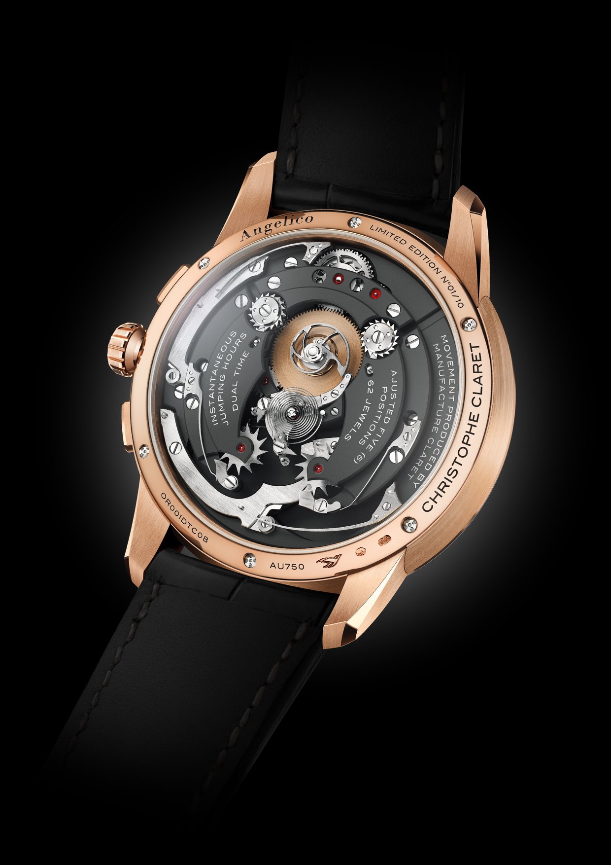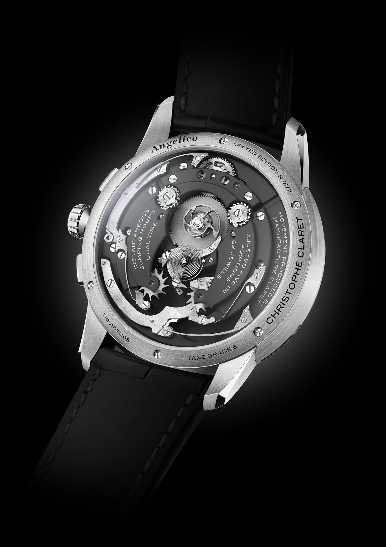 Angelico se presenta en dos ediciones limitadas a 10 ejemplares cada una, en caja de oro rojo o titanio con un diámetro de 45.5 mm para la caja. Tanto frente y vuelta invitan a admirar el mecanismo con función GMT mediante discos saltantes y una ejecución tridimensional que sólo apreciarán los amantes de la relojería.