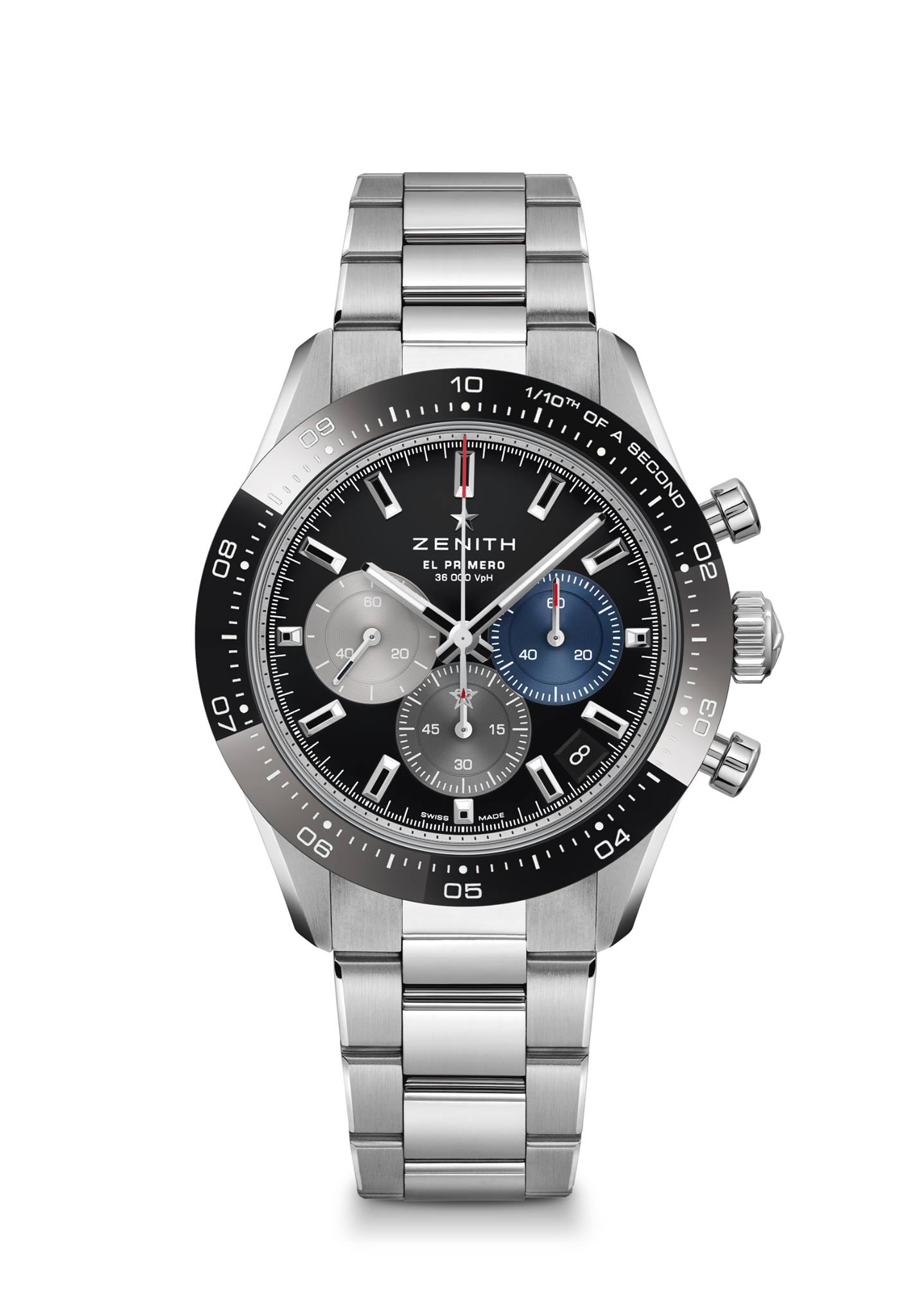 El reloj, el Choronomaster Sport, que luce más juvenil que nunca con un bisel de cerámica negra, totalizadores en dos grises y azul.