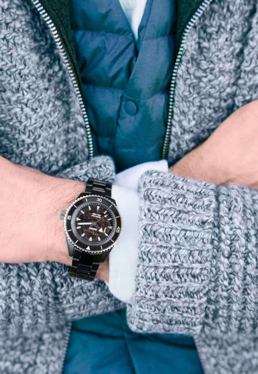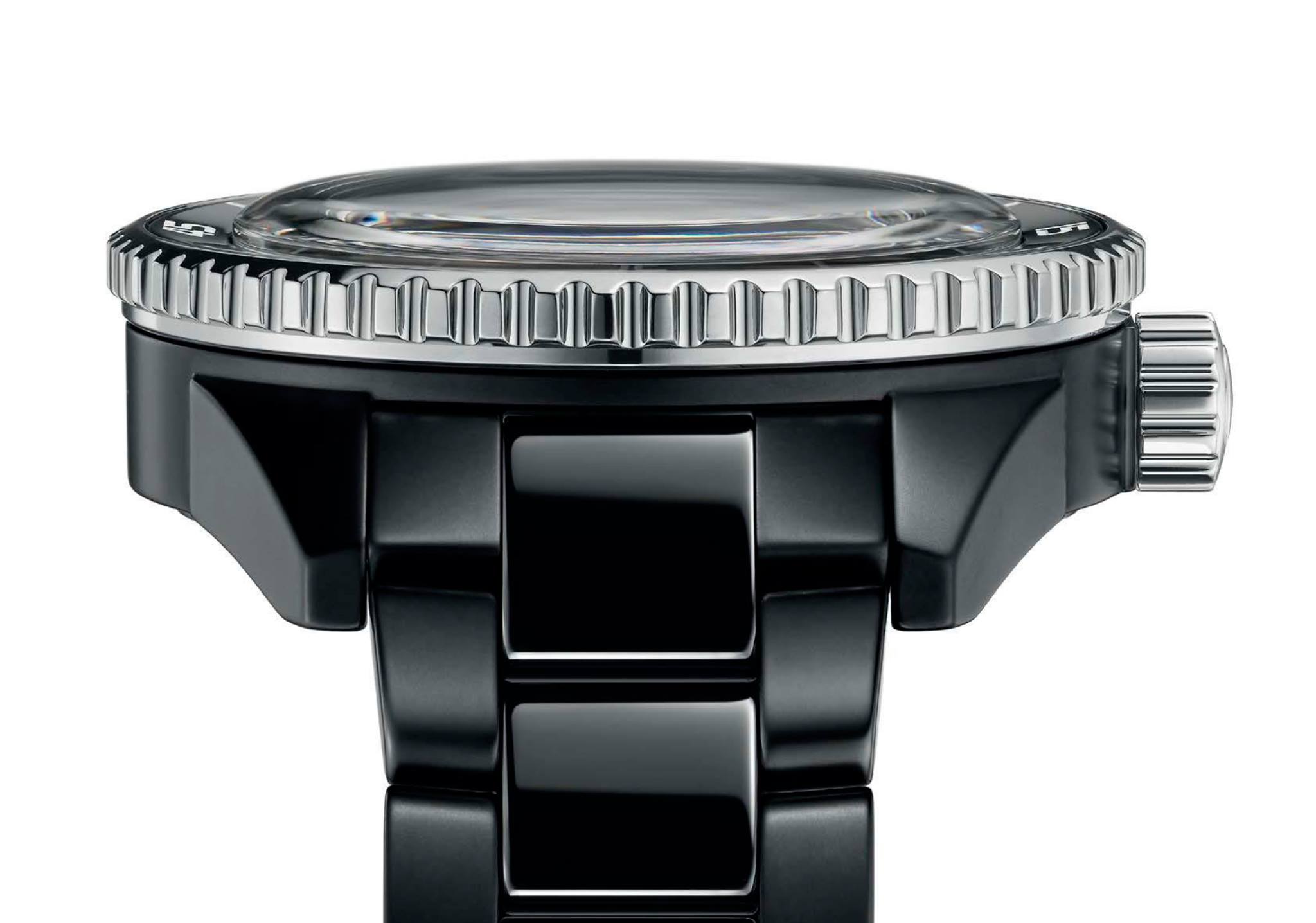 También se lleva en una pulsera de cerámica negra mate y pulida. Adicionalmente, el mismo reloj, pero con una correa de caucho negra. Finalmente, el más distintivo de los 4 relojes es el que se encuentra en una caja de cerámica de plasma de color gris oscuro. Cuenta con elementos contrastantes en acero inoxidable endurecido y pulido, y viene con un bisel azul y detalles en la carátula. Se abraza al pulso mediante una pulsera de cerámica de plasma mate y pulida.