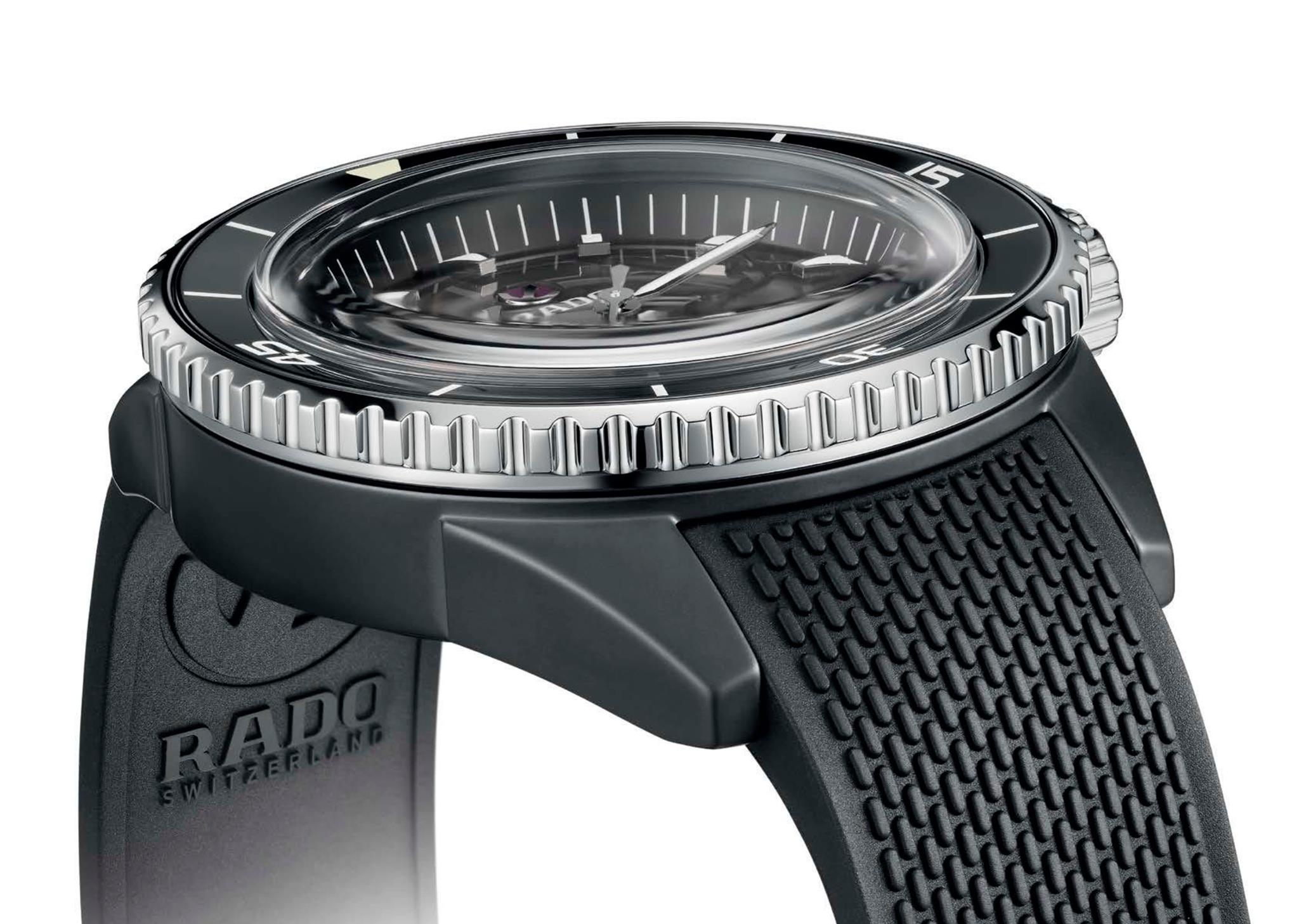 En total, se presentan 4 versiones del Rado Captain Cook High-Tech Ceramic. El primero tiene una caja de cerámica negra mate, un bisel y una corona de acero inoxidable con revestimiento de PVD en tono oro rosa y un brazalete de cerámica negra mate y pulida. Los elementos de color dorado también se encuentran en la carátula. Una más, que es casi idéntica, pero con elementos contrastantes de acero inoxidable templado pulido o rodiado.