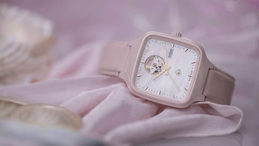 Se eligió el cuero de color rosa claro y una caja de cerámica de alta tecnología a juego como elementos básicos del reloj. La incorporación de una esfera abierta de nácar de color blanco confiere un aspecto lujoso a la exclusiva forma cuadrada y, a la vez, hace que sea lo suficientemente versátil como para usarlo de día y de noche.