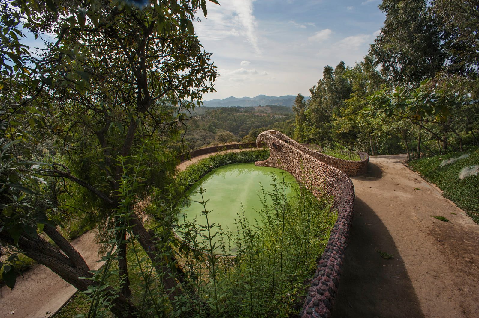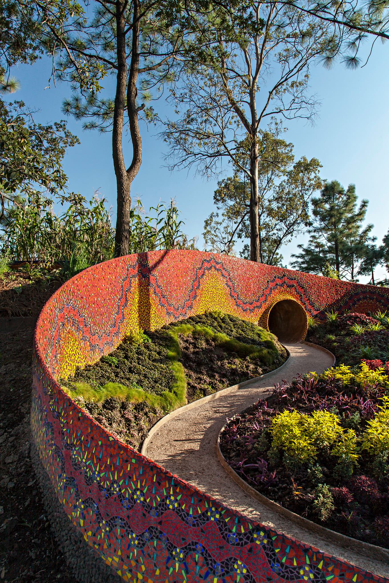 Para la creación del parque se buscó integrar la arquitectura con la naturaleza, teniendo así un concepto lúdico entre curvas, subidas, bajadas, rampas y túneles. El concepto orgánico refuerza el espacio como un lugar escultórico, las construcciones combinan distintos sistemas constructivos y materiales, como: el ferrocemento, las piedras del lugar, el tezontle y la pedacería de azulejo de una amplia paleta de colores.