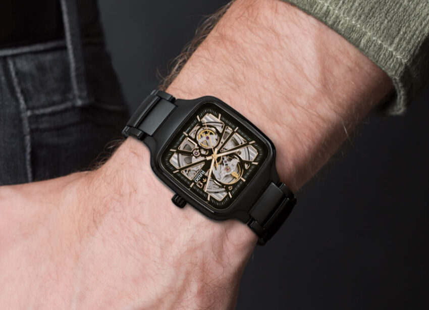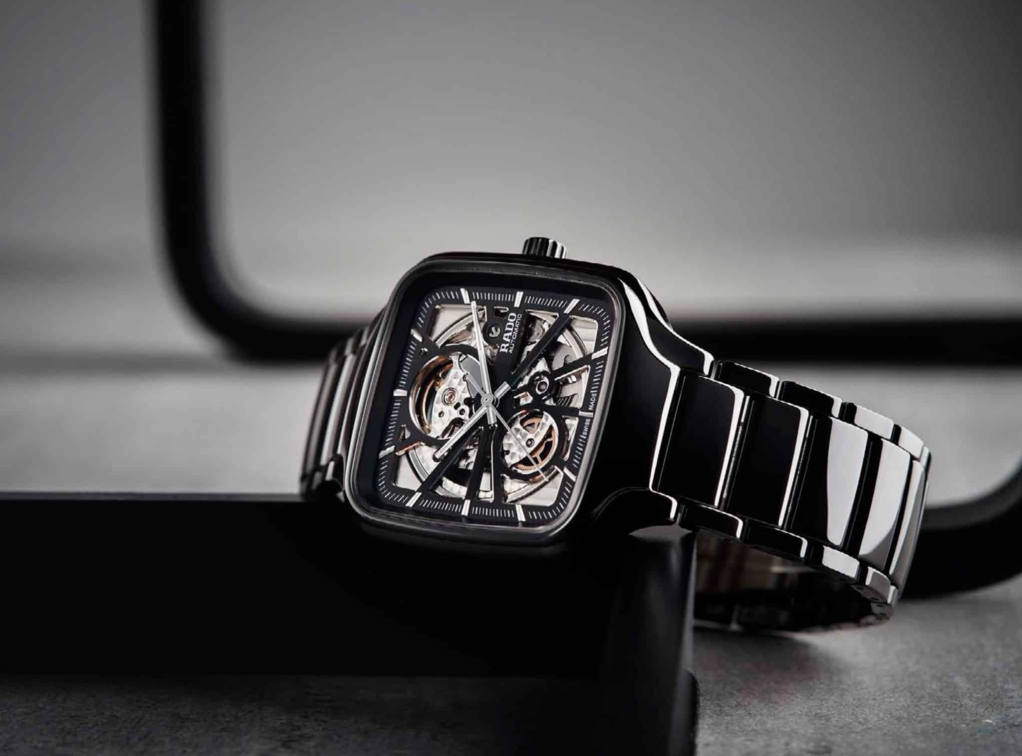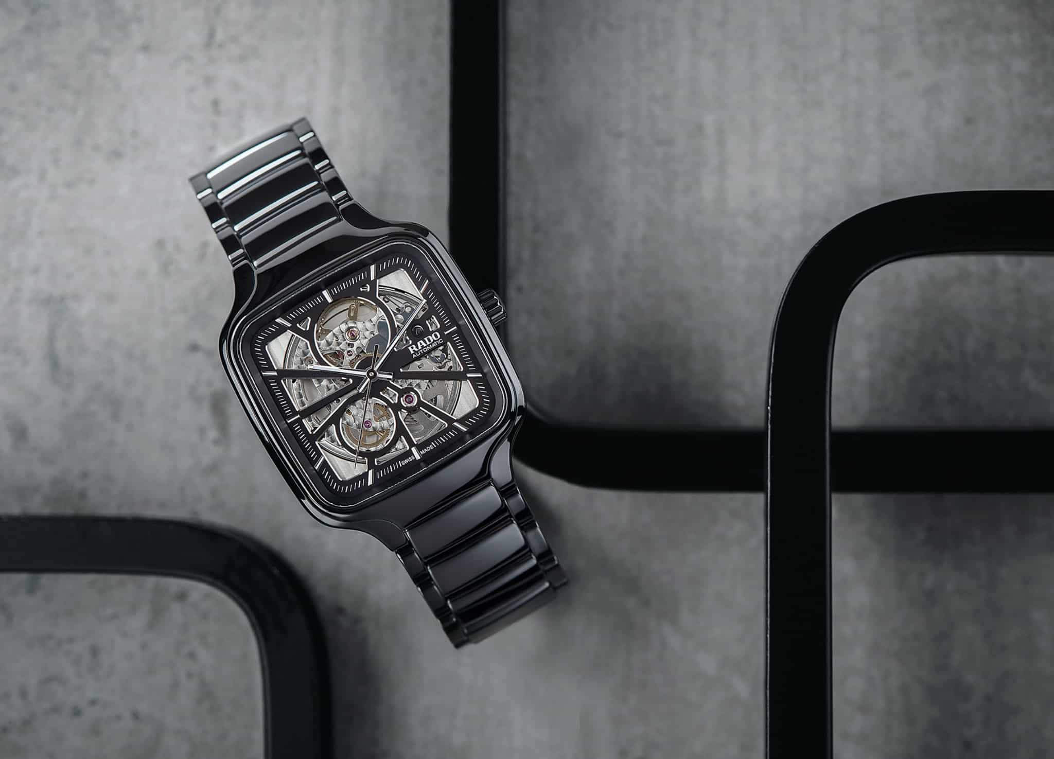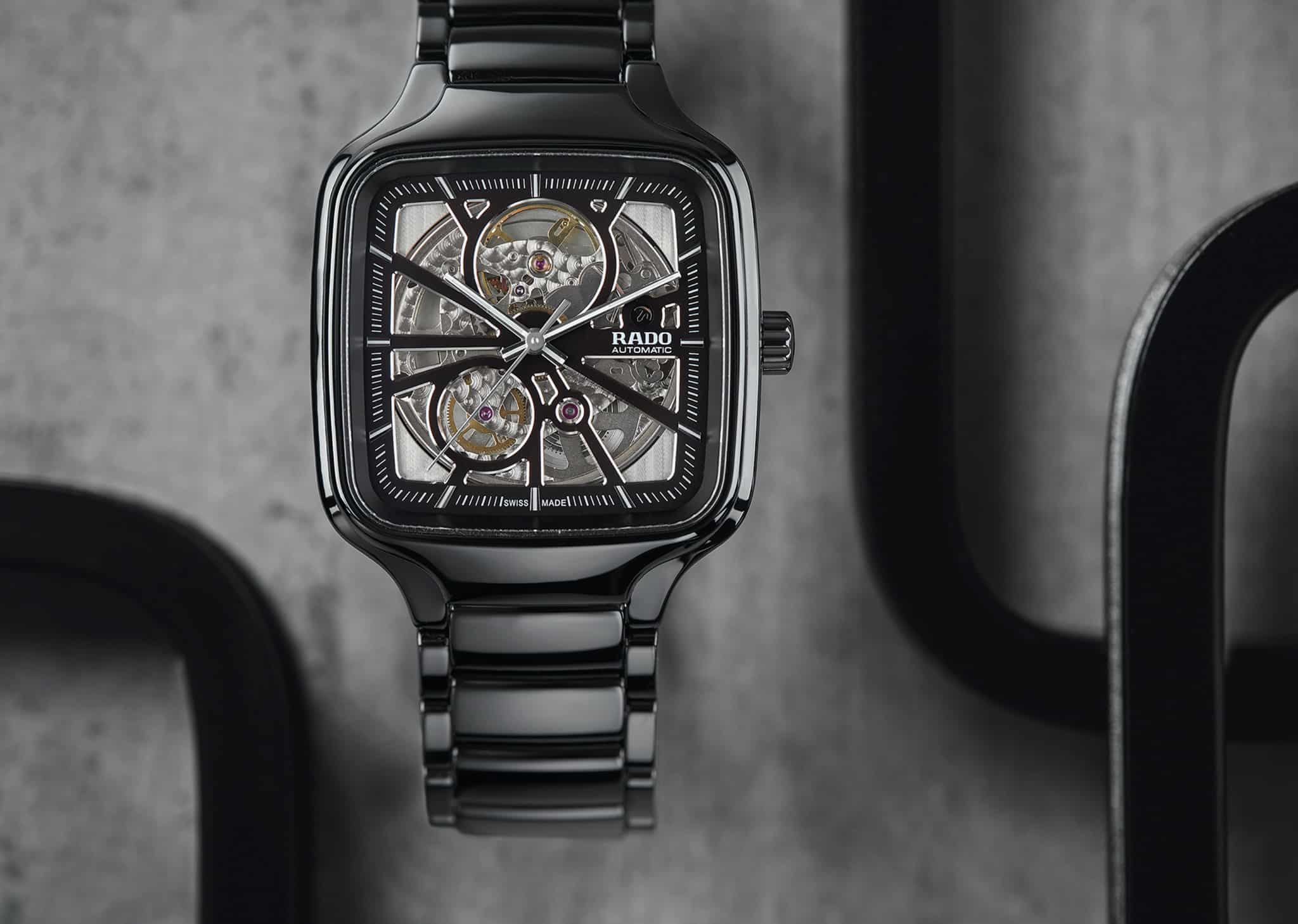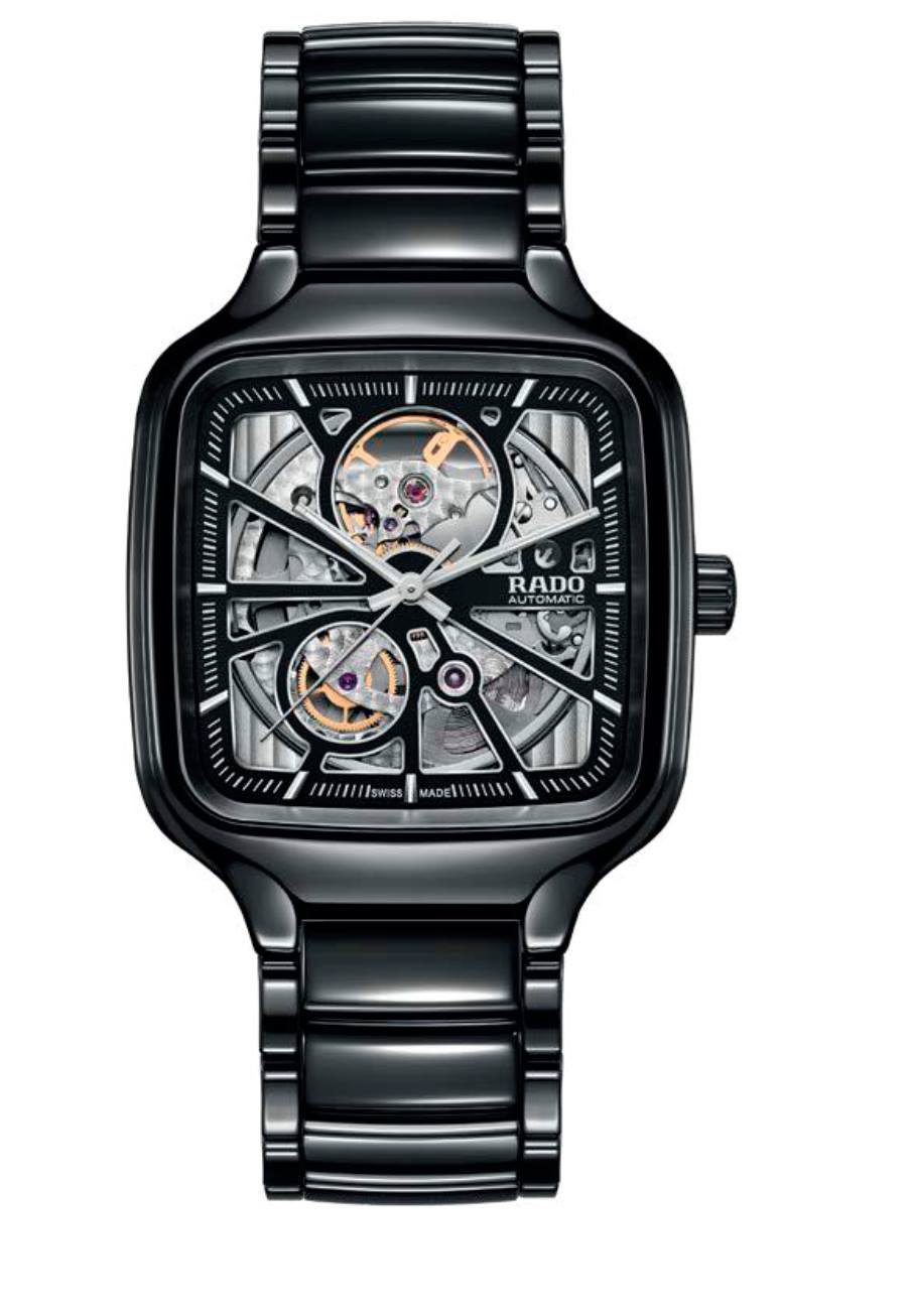 Rado True Square Automatic se presentó con nuevas referencias: carátula sólida en verde, azul o negra con acabado soleil y fabricación de cerámica para caja y brazalete. Y una más con calibre esqueletado y dial calado, conjunto en cerámica negra o blanca, ideal para la pareja.