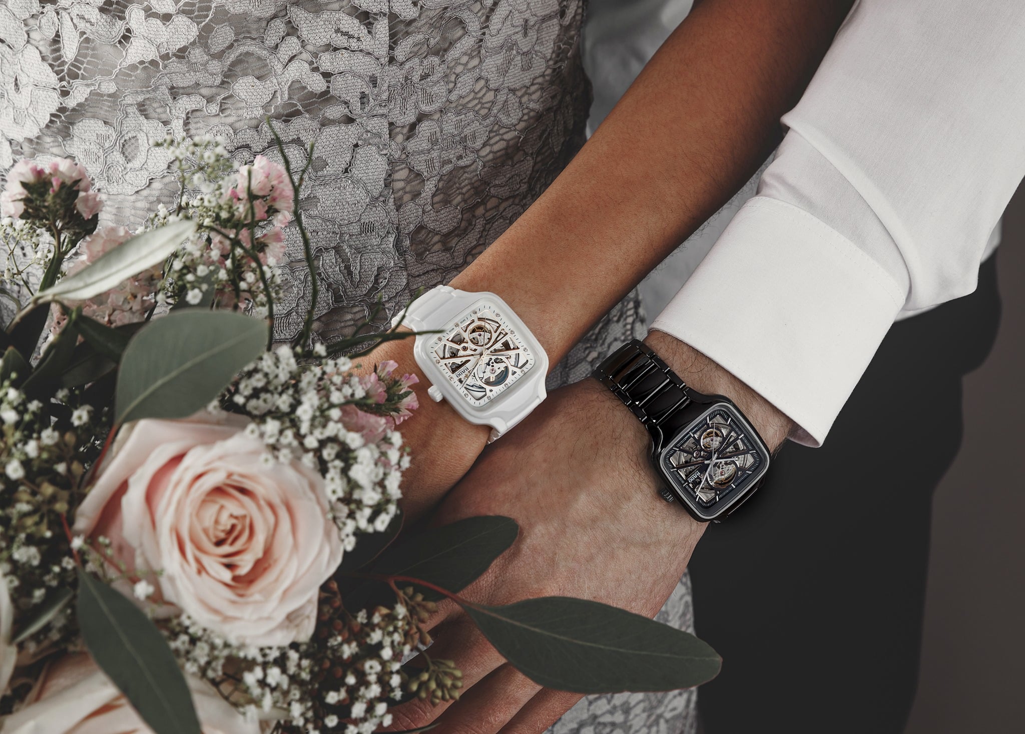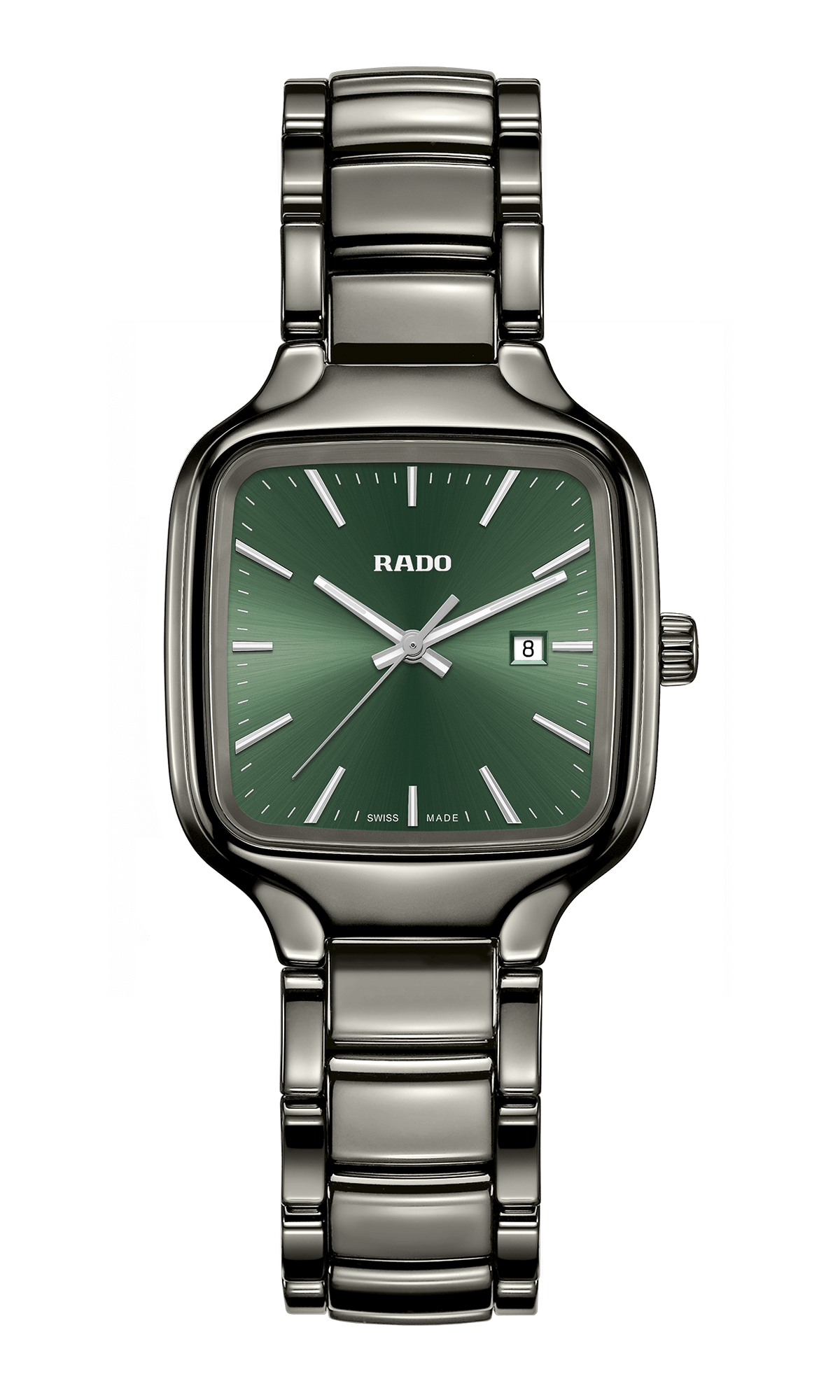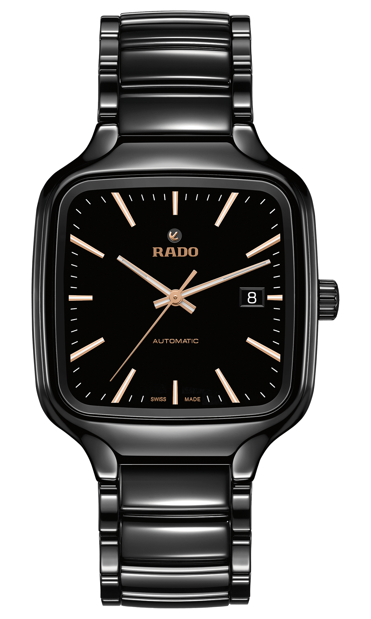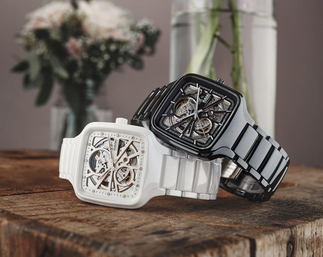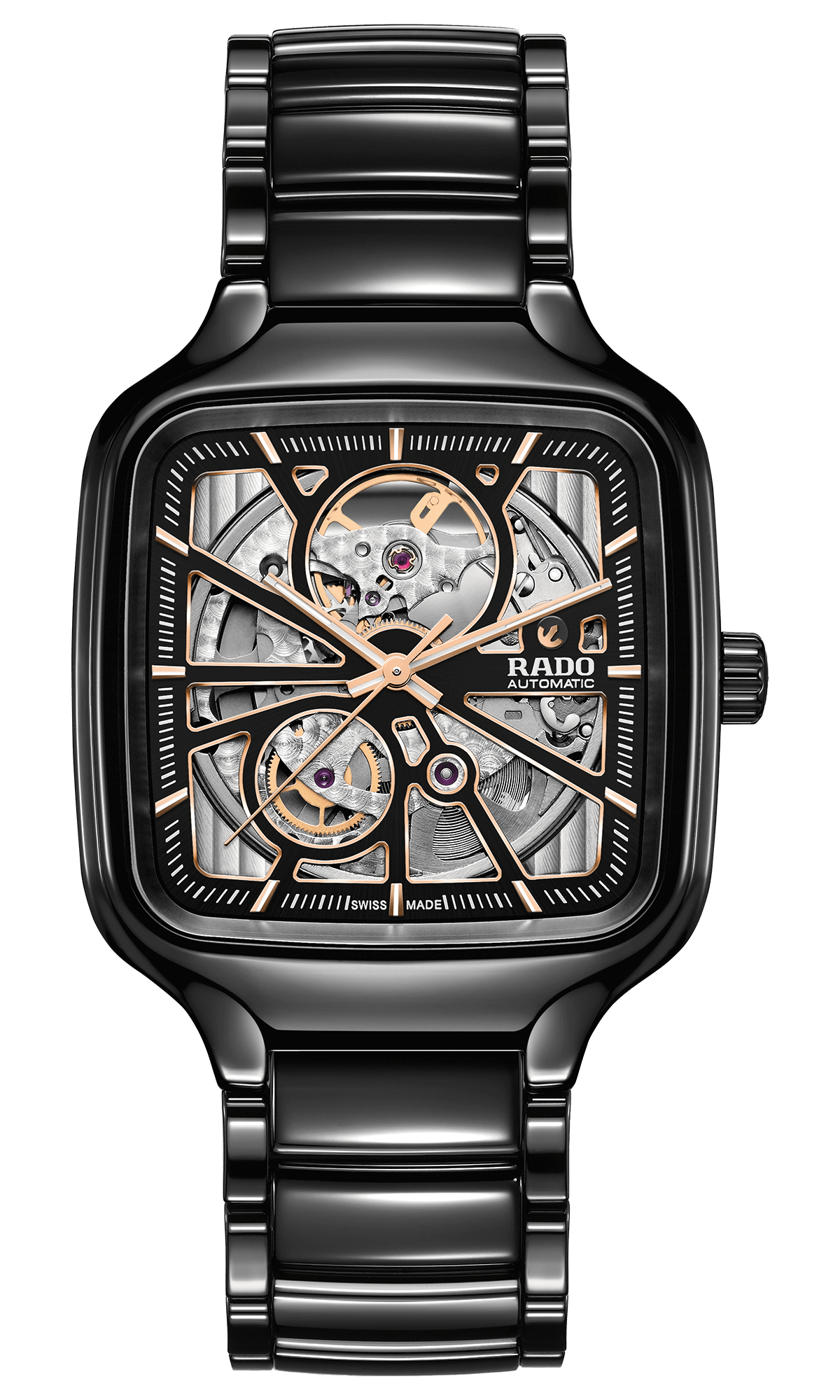 Rado True Square Automatic se presentó con nuevas referencias: carátula sólida en verde, azul o negra con acabado soleil y fabricación de cerámica para caja y brazalete. Y una más con calibre esqueletado y dial calado, conjunto en cerámica negra o blanca, ideal para la pareja.