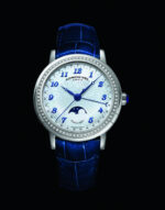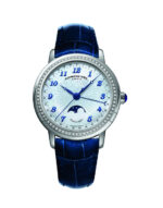 Equipado con una caja de acero pulido de 36 mm, engastado con 68 diamantes, el Lady Maestro Phase de Lune exhibe las horas en azul en una carátula de madre-perla blanca. En su centro, una decoración guilloché soleil deja espacio para la fase lunar a las 6. Las manecillas de horas, minutos y segundos también son de color azul y cuentan con los diseños más clásicos de la relojería. Una cuarta manecilla indica la fecha, trazando un arco lunar. Por último, la correa azul de cocodrilo hace juego con la piedra de la corona a las 3 horas.