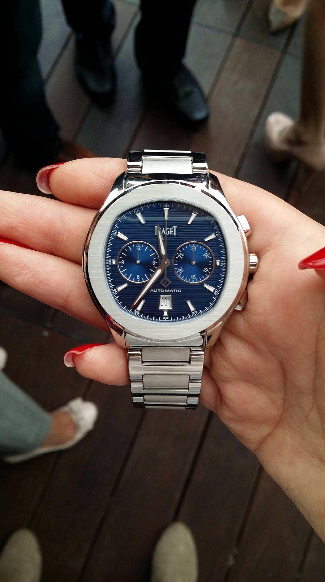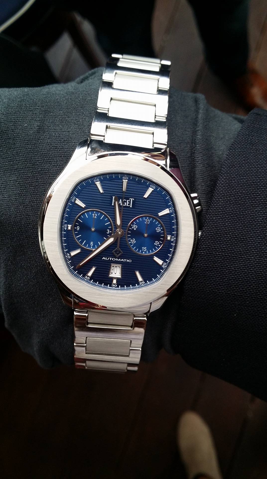 En él es posible hallar una carátula azul con motivos guilloché divididos por marcadores luminiscentes. Su fondo de cristal de zafiro deja al descubierto los acabados del nuevo calibre Piaget 1160P de movimiento automático y su masa oscilante gris antracita grabada con el escudo de armas de Piaget. El reloj cuenta con una reserva de marcha de 50 horas y una frecuencia de 4 Hz.