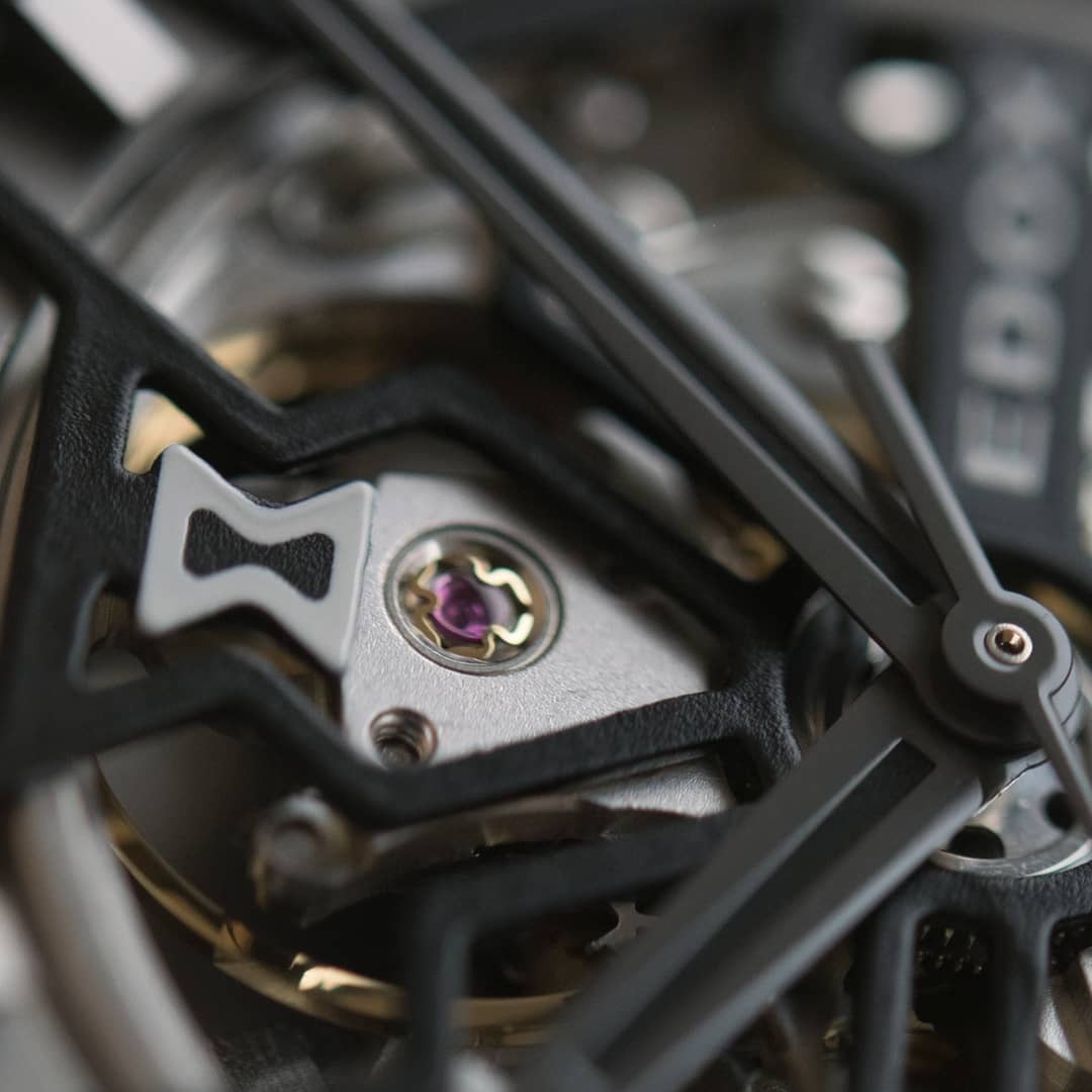 La transparencia deja ver cada elemento del reloj y la forma tan precisa en la que trabaja su órgano regulador liberando energía a la transmisión y siendo ajustada por el sistema de escape.