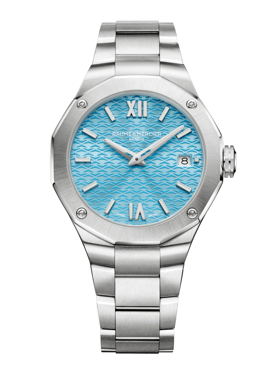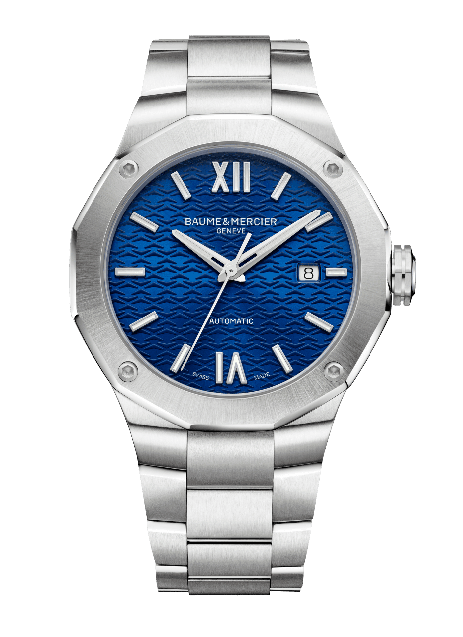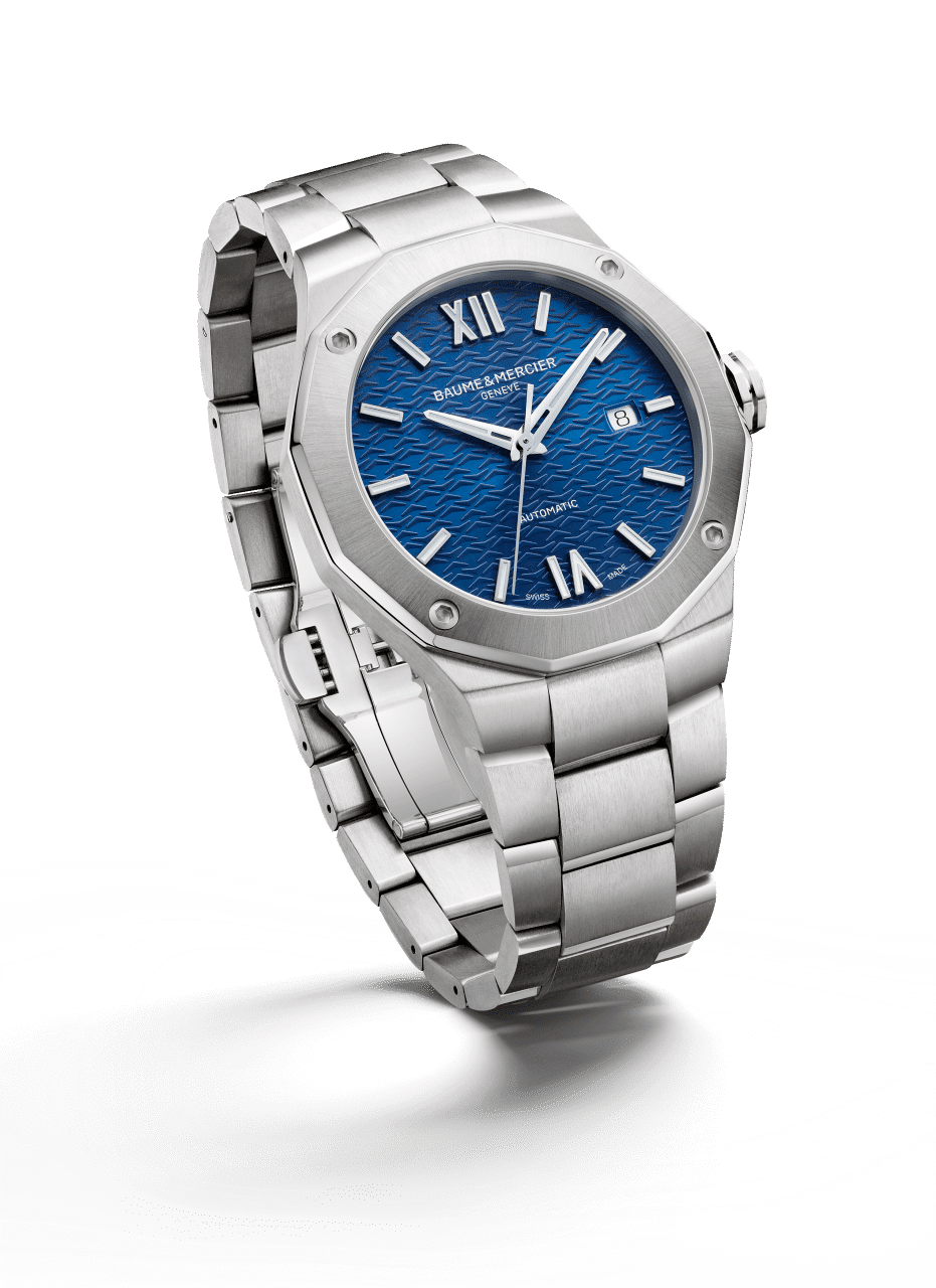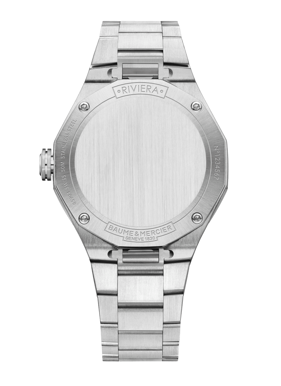 En su renacimiento, el Riviera vuelve en tres variantes de tamaño, cada una en acero: de 36 mm, 42 mm y 43 mm de diámetro. Fiel al original, el Riviera automático “Swiss Made” de 42 mm de diámetro actualiza los rasgos esenciales del modelo mítico: un bisel dodecagonal con sus 12 facetas de rigor, una carátula de decoración única (azul, negra o plateada) que simboliza el encuentro entre la montaña y el océano (el choque del agua con la piedra), y brazaletes intercambiables de acero o caucho azul con un efecto azul integral. La silueta del reloj original de 1973 sigue ahí, pero se adapta a los gustos de hoy.