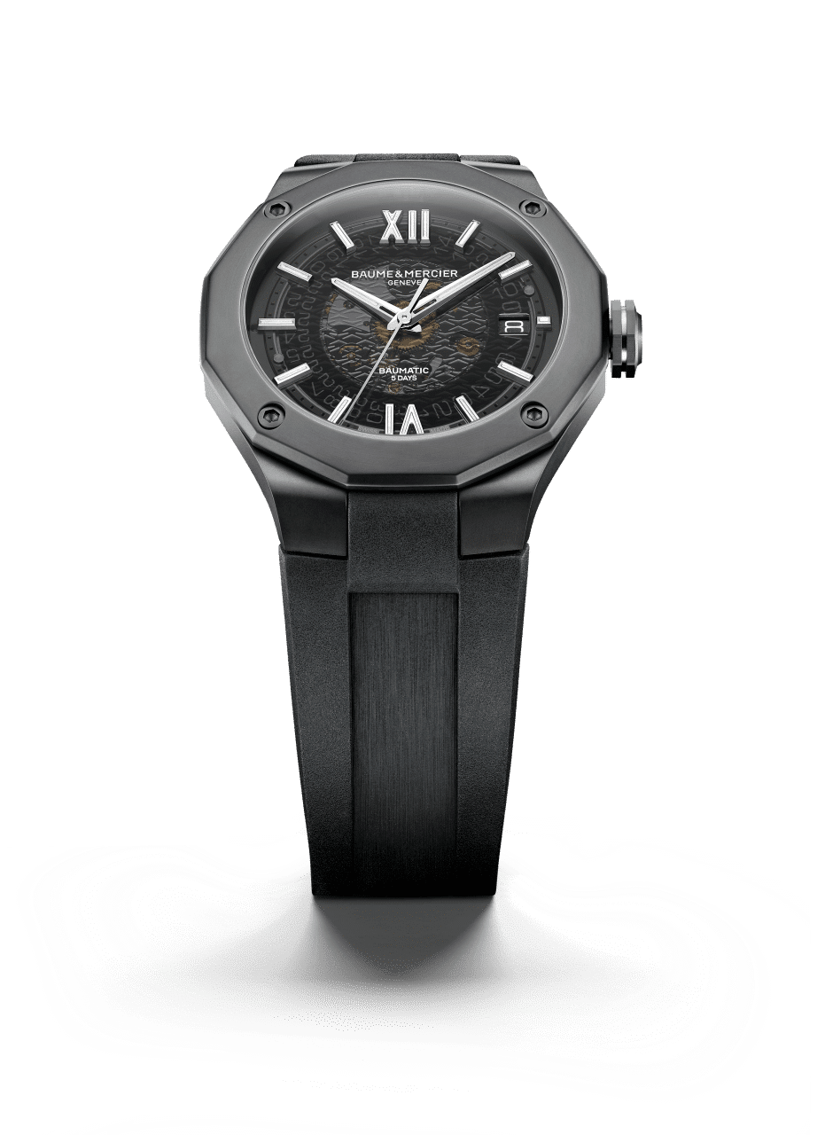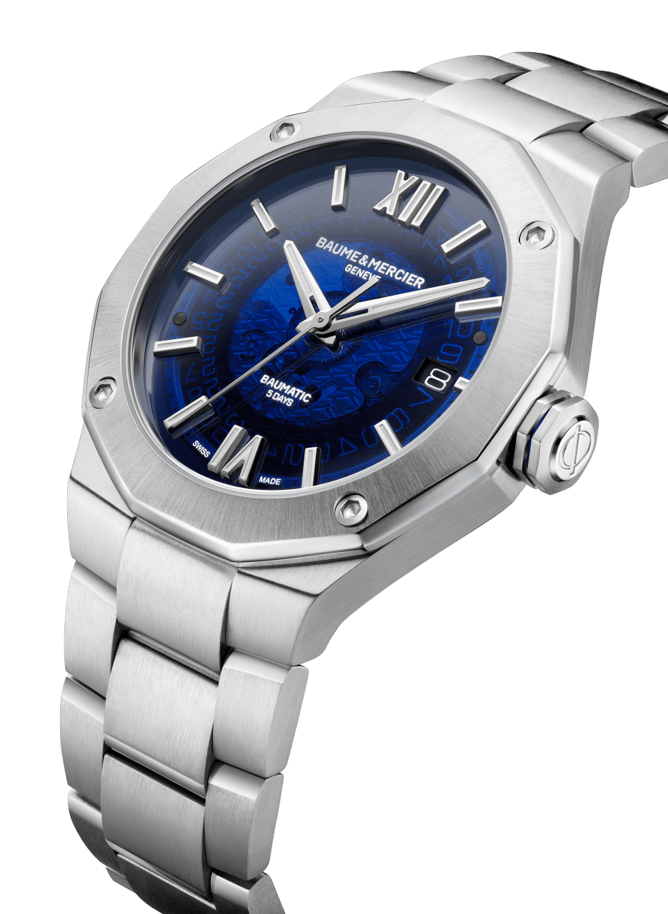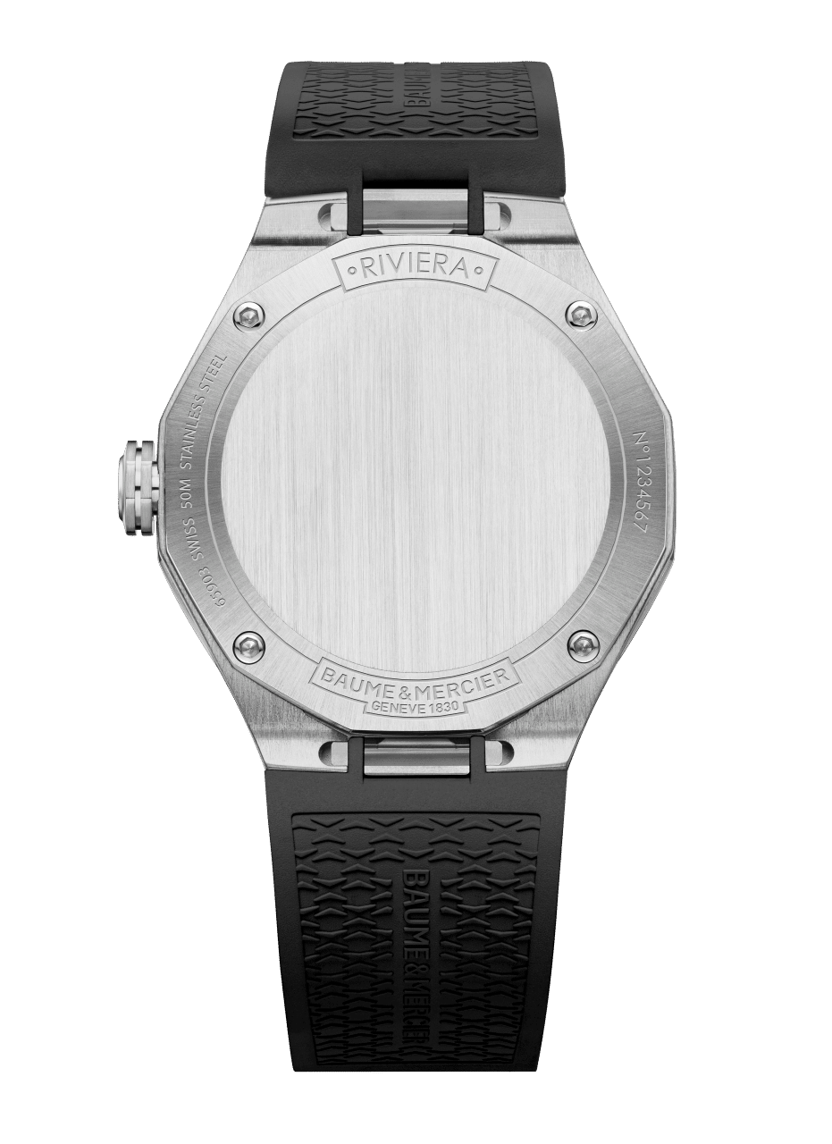 El Riviera Baumatic se encuentra disponible en una carátula de zafiro en azul ahumado, decorada con un brazalete de acero integrado o una carátula de zafiro gris ahumado, decorada con un brazalete flexible negro. La transparencia de los diales opacos permite admirar los engranajes del movimiento Baumatic, como si el tiempo no dejara huella en este reloj que trasciende al devenir de los tiempos sin pestañear.
