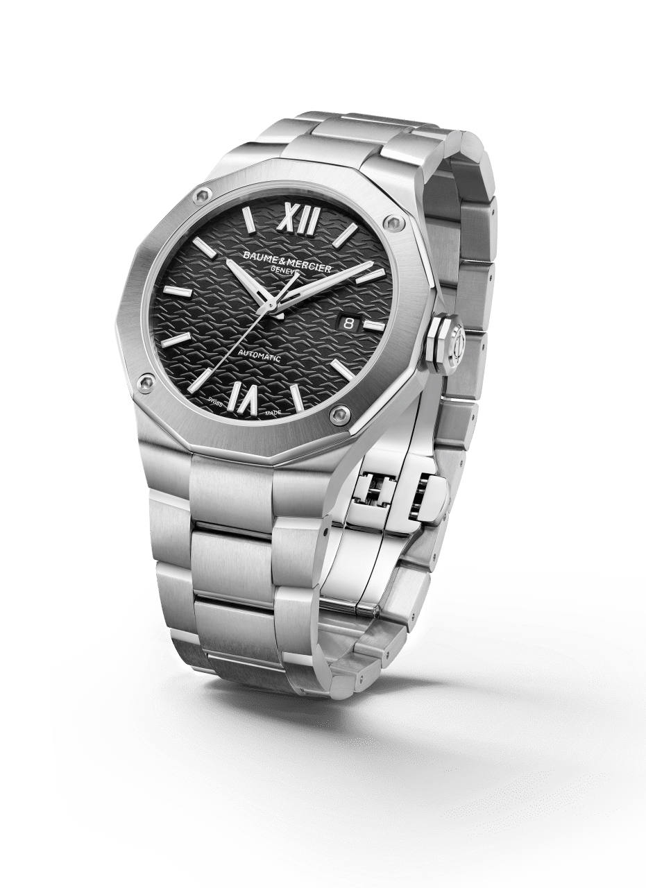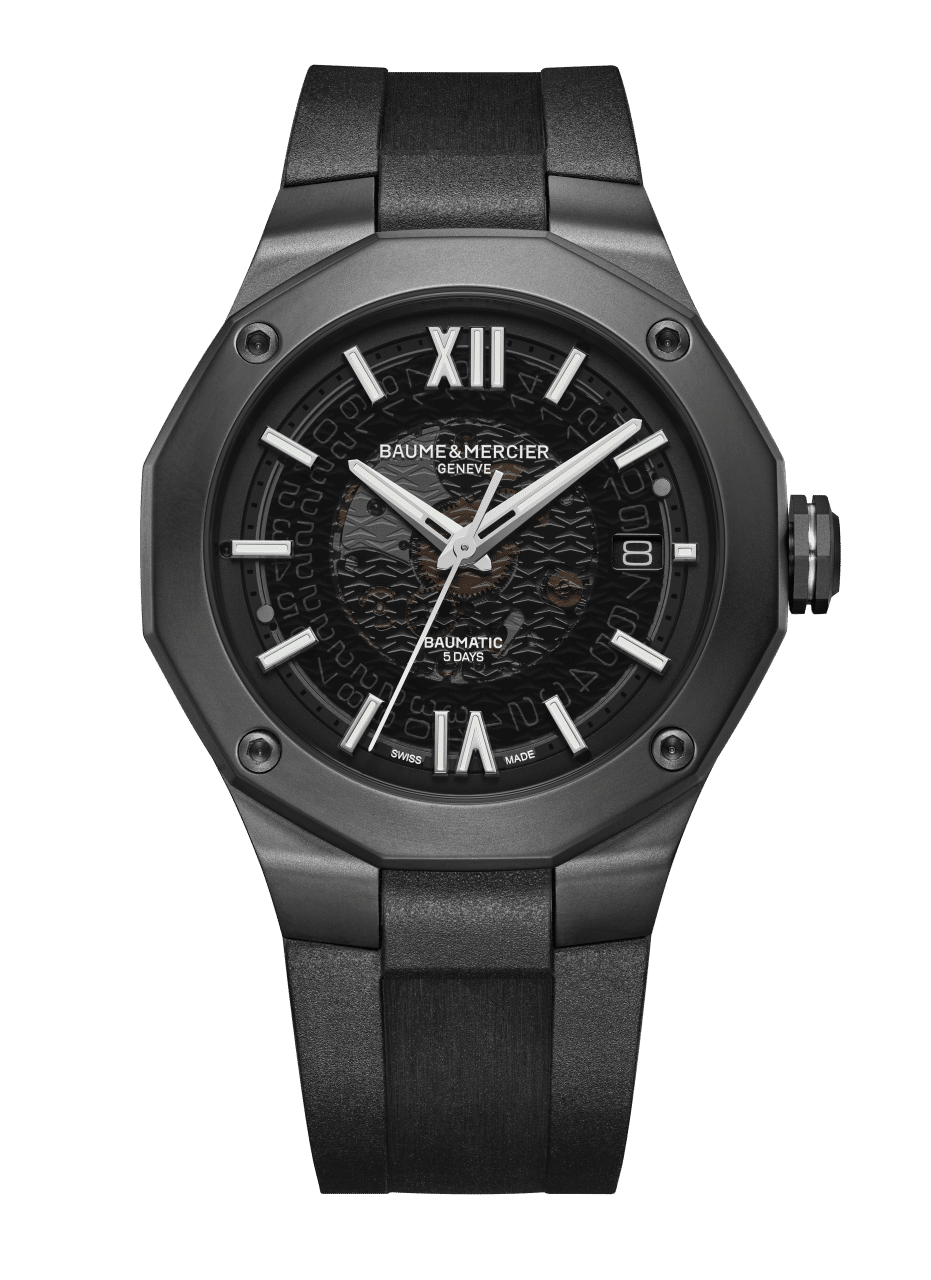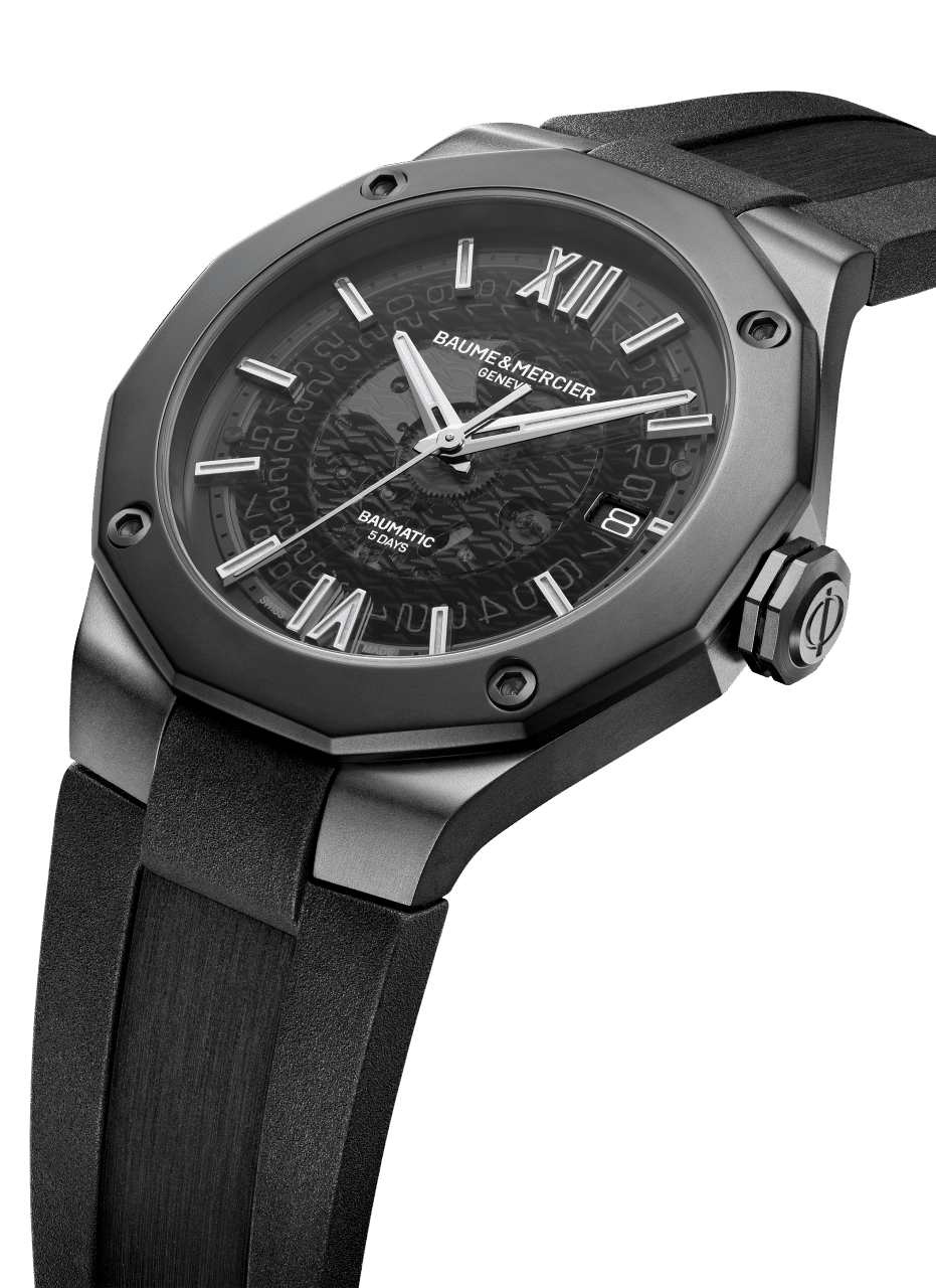 El Riviera Baumatic se encuentra disponible en una carátula de zafiro en azul ahumado, decorada con un brazalete de acero integrado o una carátula de zafiro gris ahumado, decorada con un brazalete flexible negro. La transparencia de los diales opacos permite admirar los engranajes del movimiento Baumatic, como si el tiempo no dejara huella en este reloj que trasciende al devenir de los tiempos sin pestañear.