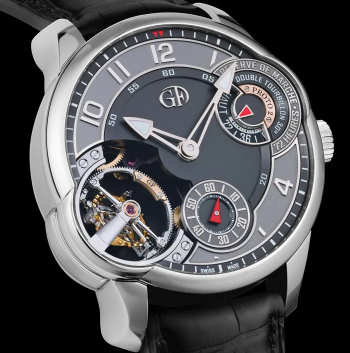 Ahora bien, para poner en contexto debemos retomar un poco de la historia y ADN de Greubel Forsey, una firma creada en el año 2004, que surgió con la idea reinterpretar el tourbillon con el fin de concederle un uso práctico y efectivo dentro de la relojería contemporánea. Hace un par de años (2011), Robert Greubel y Stephen Forsey fueron galardonados con el “International Chronometry Competition” por el museo de la relojería de Le Locle, la pieza que presentaron y acreedora del mismo fue un particular torbellino por partida doble, colocado a 30°, dicha posición asimétrica elevada al cuadrado, compensa de manera mucho más efectiva los efectos negativos de la gravedad sobre el volante y escape. Este año, a casi una década del nacimiento de la marca, “GF” lanza una reinterpretación de su primera invención fundamental –el “Double Tourbillon 30°”– en una caja asimétrica, rompiendo así con la arquitectura en la que este mecanismo se ha presentando hasta la fecha. En respuesta a su conservación estética inédita, la reserva de marcha se muestra mediante un disco rotativo, que completa el aspecto innovador del reloj. El “Double Tourbillon Asymétrique” se presenta en una edición única compuesta por 11 piezas en oro blanco y 11 piezas en oro rojo 5N.