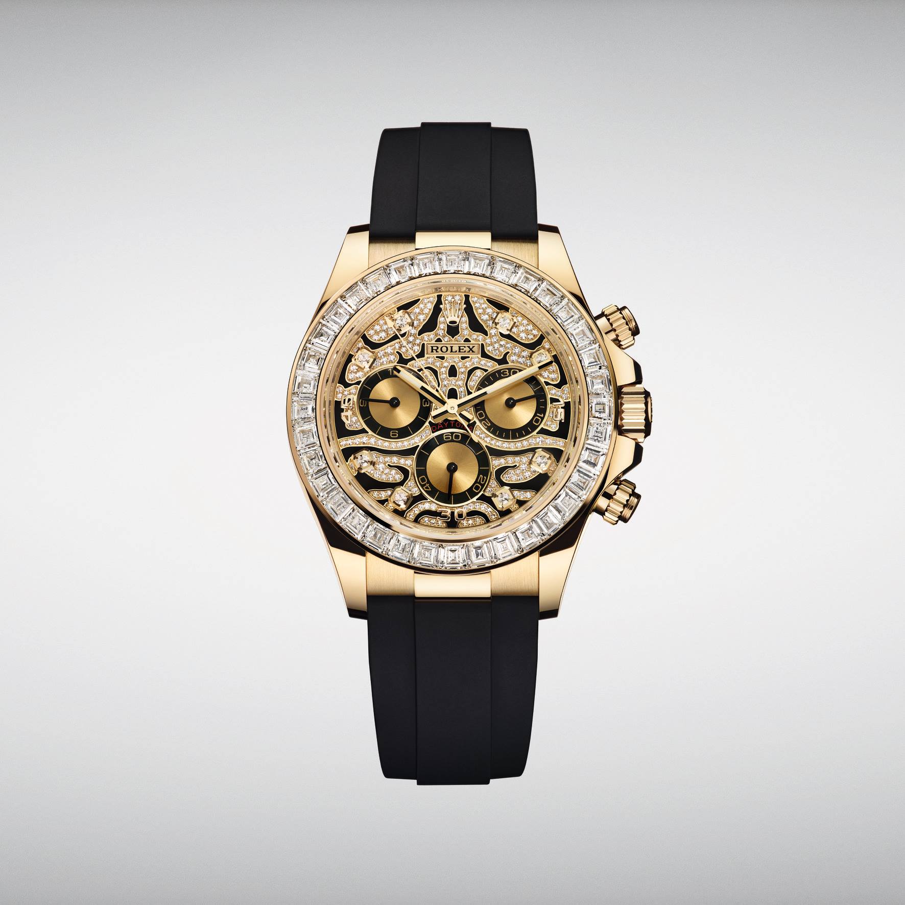 La firma presentó un reloj que se convertirá en objeto de deseo al mismo tiempo que se erige como uno de los Daytona más polémicos de los últimos tiempos. Lanza una ejecución en oro amarillo de 18 quilates, con bisel engastado con 26 diamantes talla trapecio y carátula lacada negra y diamantes. Los totalizadores lucen color champagne y ocho índices diamantes complementan la ecuación estética. El motor es el increíble calibre 4130 manufactura, un cronógrafo mecánico automático con rueda de pilares y embrague vertical, cuyo sistema de carga remonta en ambas direcciones y entrega 72 horas de autonomía a 4 Hz. Su rate de precisión es -2/+2, y como en todo Rolex ofrece ceritificación de Cronómetro Superlativo. La marca de la corona es el Reloj Oficial de la F1®, así como de otras competencias de motor como las 24 Horas de Le Mans.