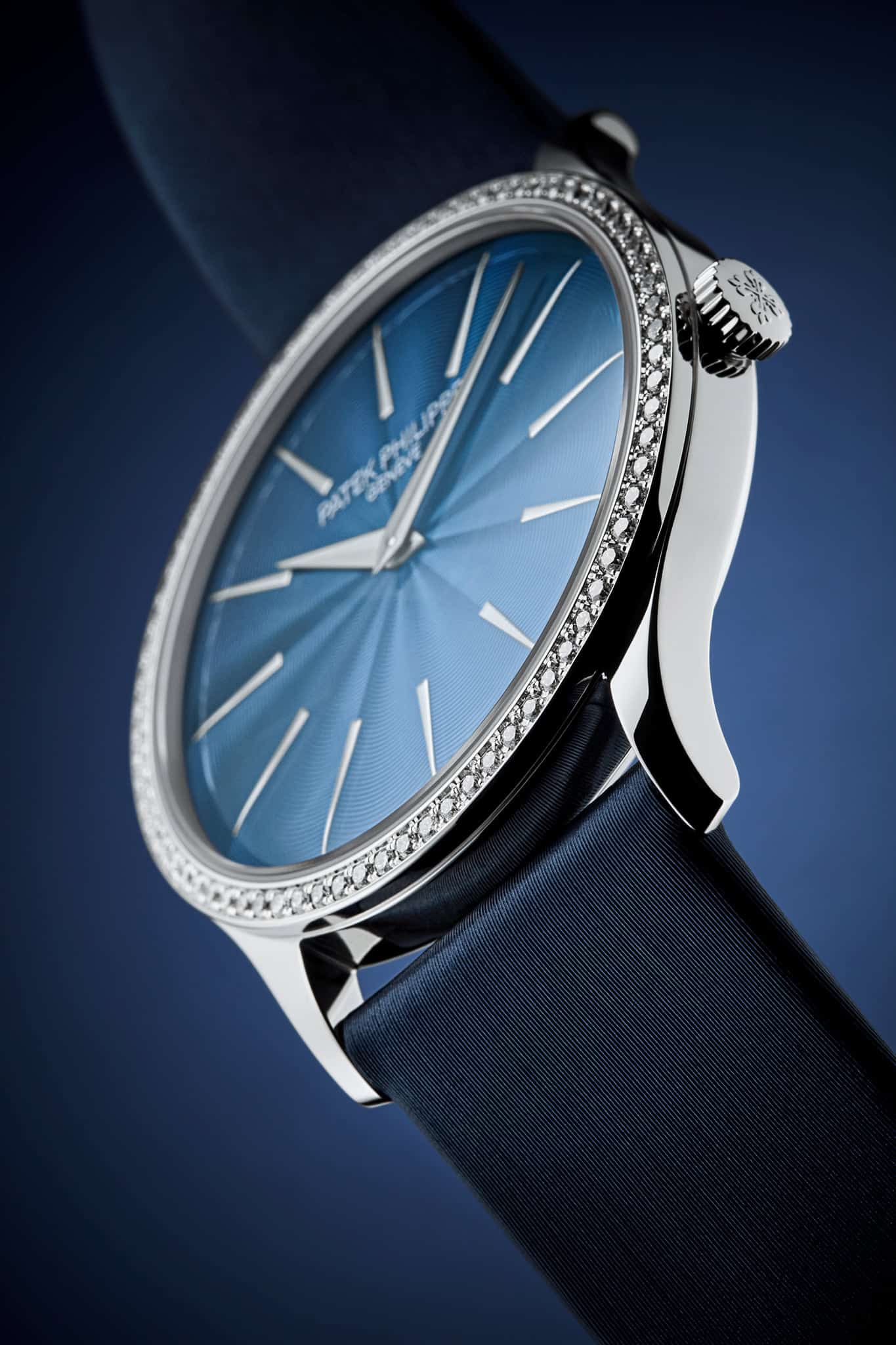 La preciosa carátula requiere un largo trabajo y unos atentos cuidados. La base, decorada con un fino grabado guilloché de finas ondulaciones concéntricas, va recubierta de varias capas sucesivas de laca transparente color azul noche. Esta decoración crea un fascinante efecto de profundidad en donde los índices tipo “flecha” de oro blanco empolvado y las agujas de forma Dauphine de oro blanco facetadas parecen flotar. Cuenta con un calibre mecánico automático 240 que vibra a 3 Hz y ofrece 48 horas de reserva de marcha.