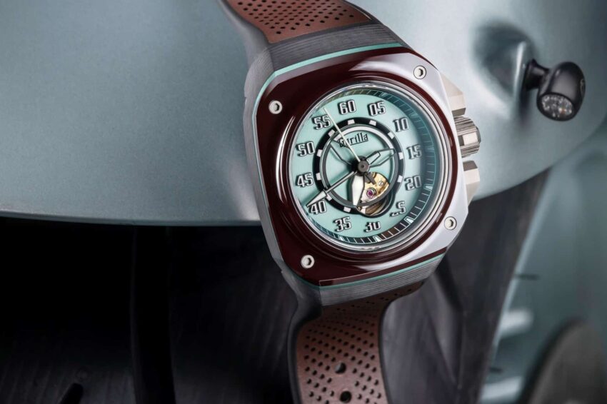 El creativo uso de materiales se extiende al bisel elaborado en cerámica marrón para combinar con la caja. Para la correa se utiliza caucho híbrido, también en marrón, con perforaciones para mayor comodidad y en referencia a los guantes de piloto. Finalmente, resalta una carátula en color “baby blue” brillante con cepillado radial. La idea detrás de la combinación de esta paleta de colores es replicar la costa de color turquesa que encuentras en el estado de California.