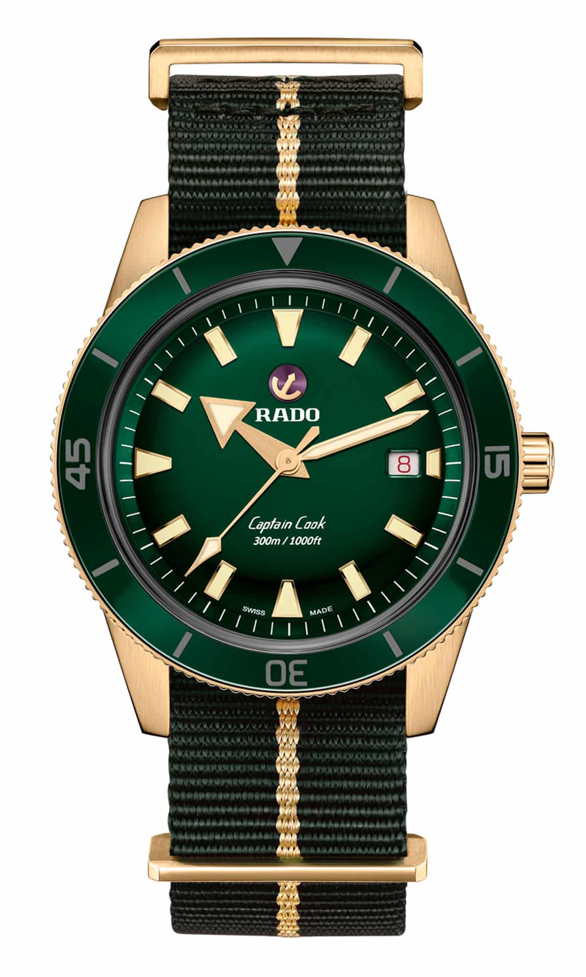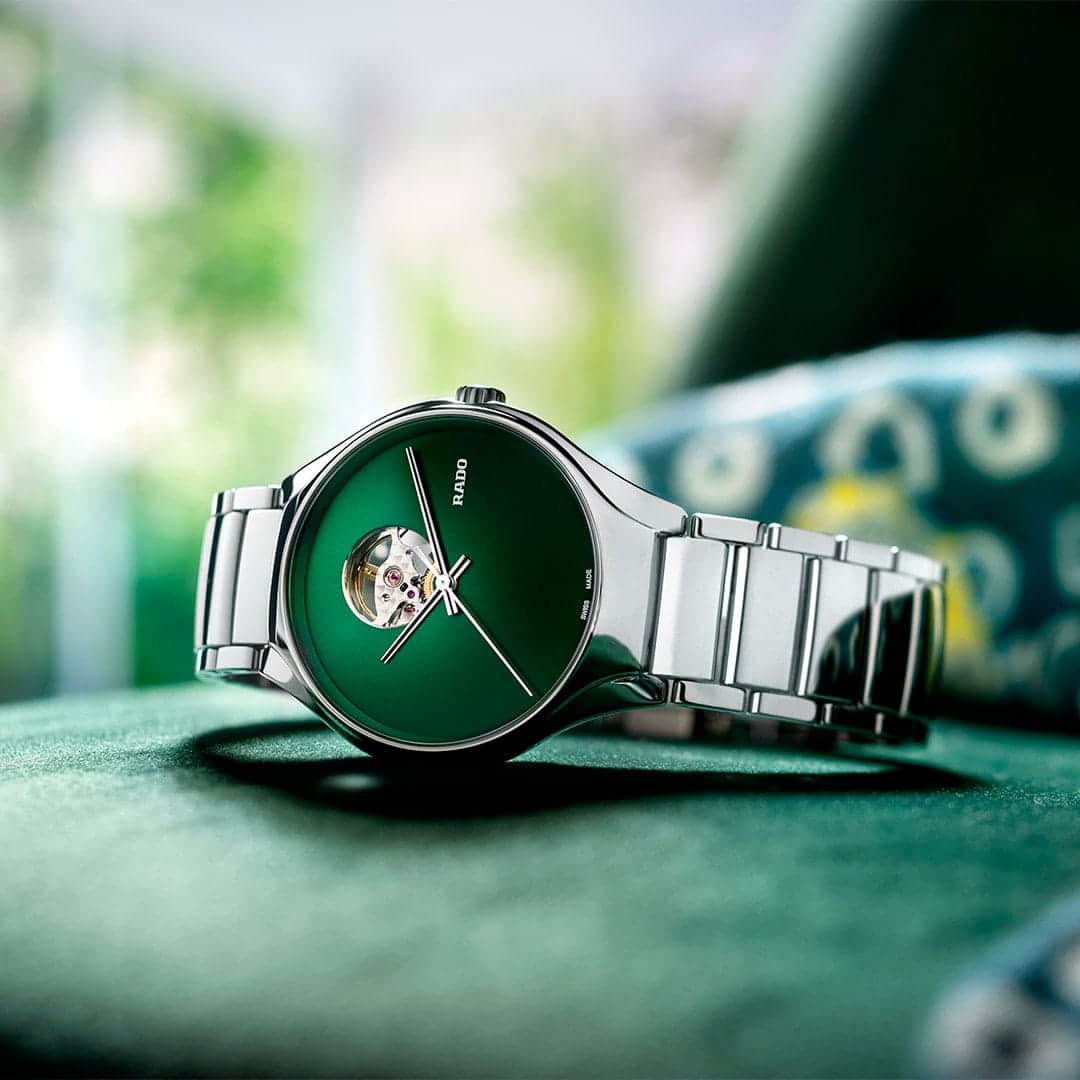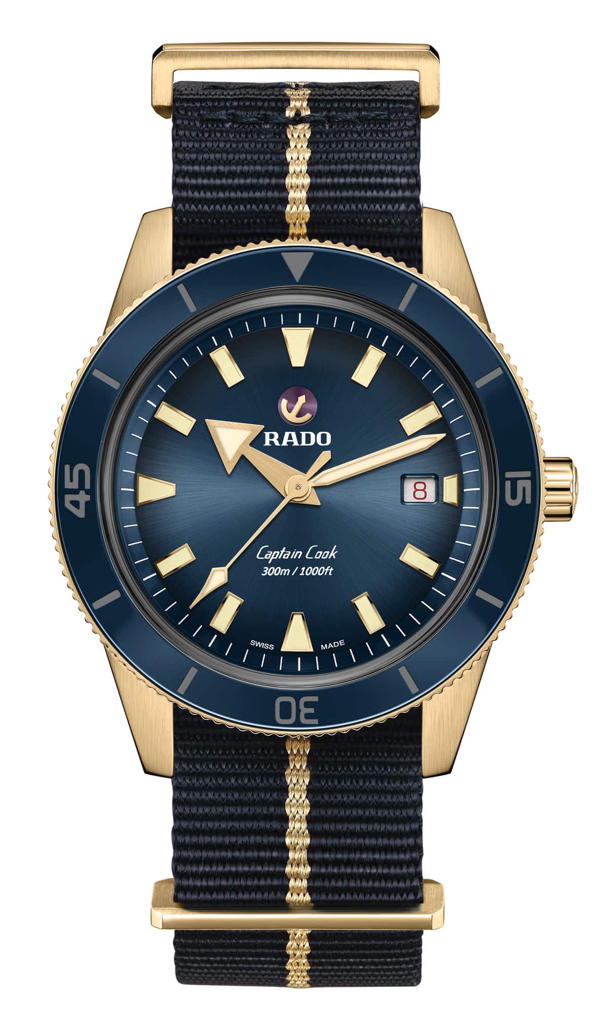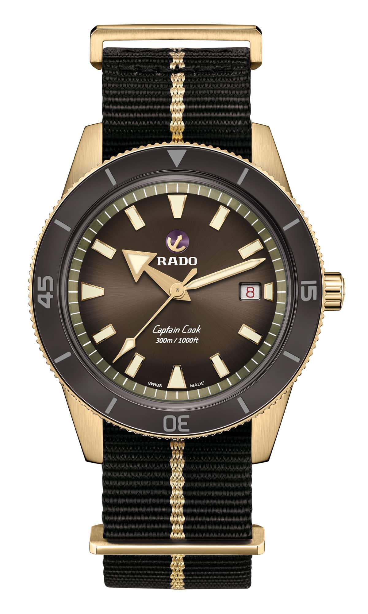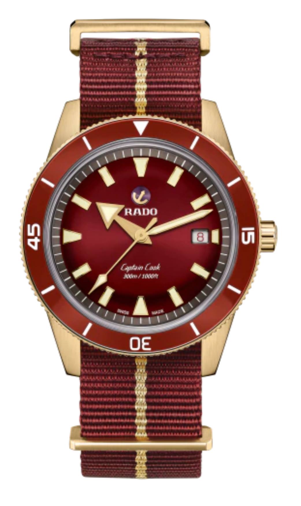 Rado presentó su modelo de buzo en 1962 con un reloj de 37 mm que lleva el nombre del explorador británico Capitán Cook. Existen varios tipos de aleaciones de bronce y Rado optó por CuAl, que comprende cobre y aluminio. Mientras que el bronce tradicional (aleación de cobre y estaño) tiende a adquirir rápidamente una pátina verde, esta aleación específica tiene mejor resistencia a la corrosión y sólo desarrollará una pátina superficial ligera por la oxidación del aluminio. Si bien la caja perderá su tono dorado bastante rápido, el proceso de oxidación permanecerá relativamente controlado y la carcasa conservará su aspecto distintivo. Además, lucirá excepcional con todas y cada una de las opciones que hay para papá en cuanto a color: verde, marrón, azul y burdeos.