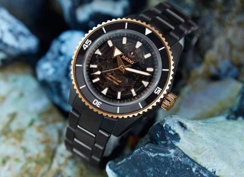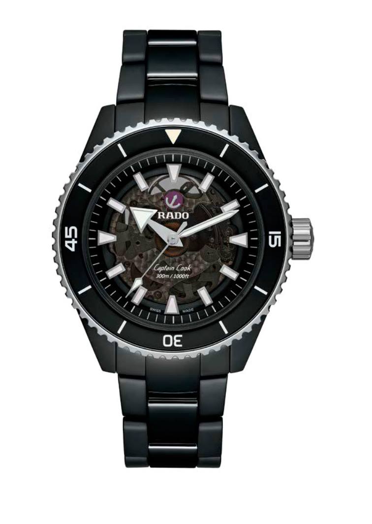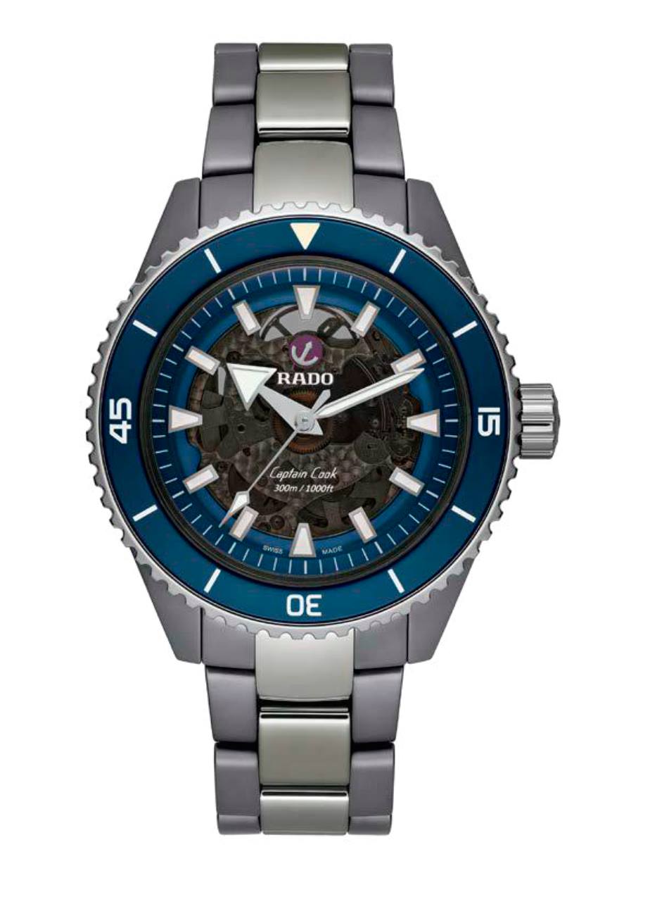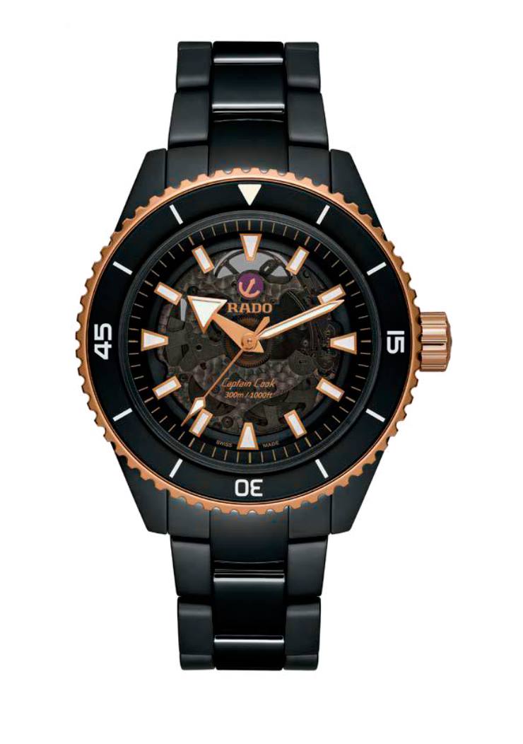 La marca brinda a su reloj de buceo estrella una interesante mezcla entre elementos emblemáticos del pasado y sus tecnologías de vanguardia con el uso de cerámica de alta tecnología. Y hay más en esta colección que solo un material diferente. La principal evolución se refiere a todos los materiales utilizados para la caja. En primer lugar, la carrura es una construcción monobloque y está hecha de cerámica negra mate o plasma mate (la edición gris). Ligera, resistente a los arañazos e hipoalergénica, la cerámica se combina aquí con elementos de contraste para el bisel y la corona, realizados en acero inoxidable con revestimiento de PVD dorado o acero inoxidable endurecido. Como era de esperar, el inserto del bisel todavía está hecho de cerámica negra o azul pulida. El fondo de caja, que tiene una ventana de zafiro teñida de negro, está hecho de titanio cepillado. En comparación con las ediciones de acero o bronce, hay otra actualización notable, y es la carátula y la forma en que está construida. En lugar de una placa de base lisa, Rado ha decidido darle a Captain Cook High-Tech Ceramic un tono translúcido teñido de negro. La carátula de zafiro, que revela parcialmente el movimiento que se encuentra debajo. Si la parte central ahora es de color ahumado, el resto de la carátula (las manecillas, los índices aplicados, la brida interior) son idénticos a las ediciones de acero. Porta el calibre R734, un movimiento automático totalmente robusto, probado y con garantías antimagnéticas y de autonomía excepcionales. La reserva de marcha es de 80 horas, a 3 Hz, porta una espiral Nivachron, que proporciona una ventaja en la vida cotidiana al proteger el reloj de los campos magnéticos.