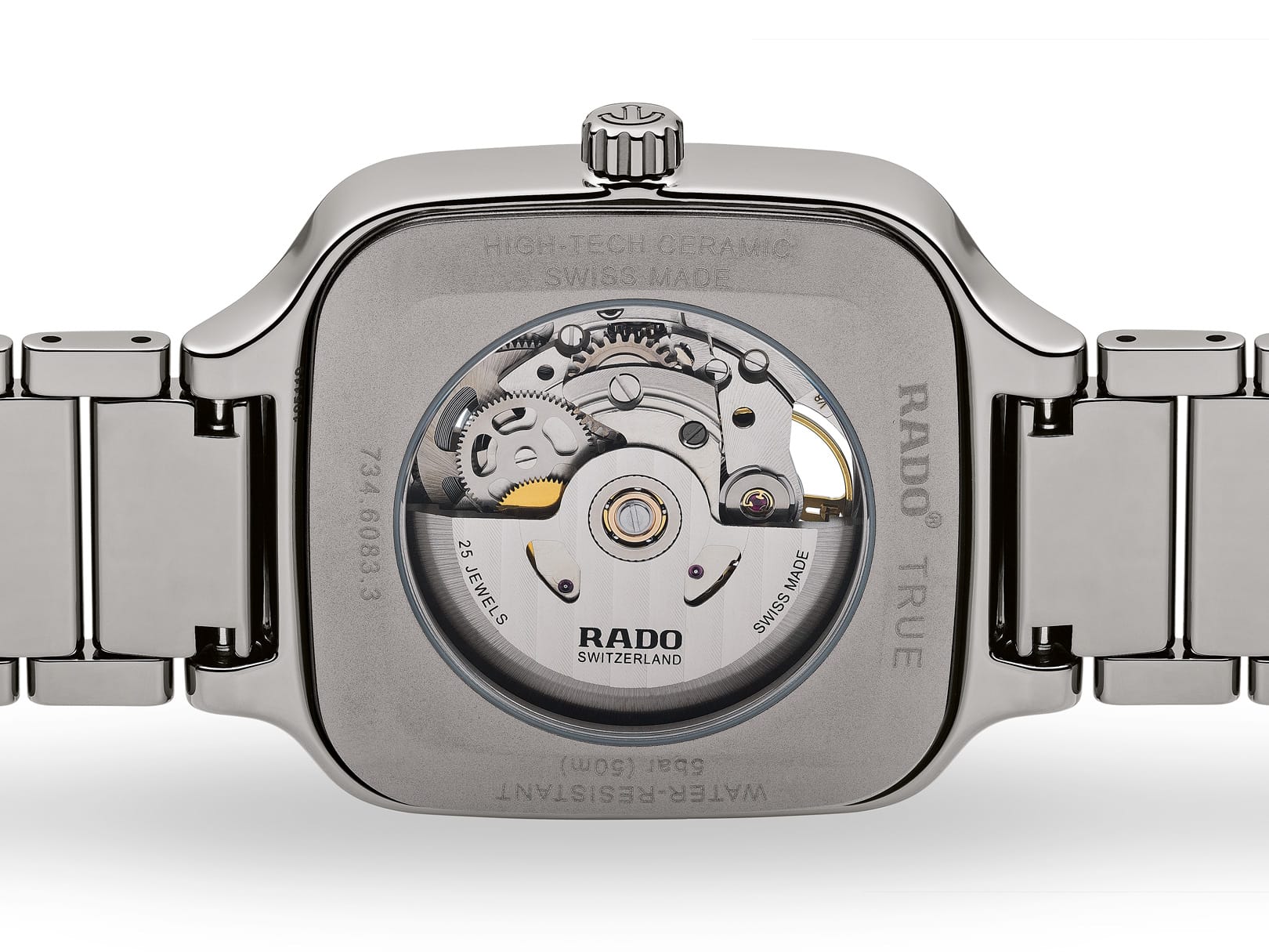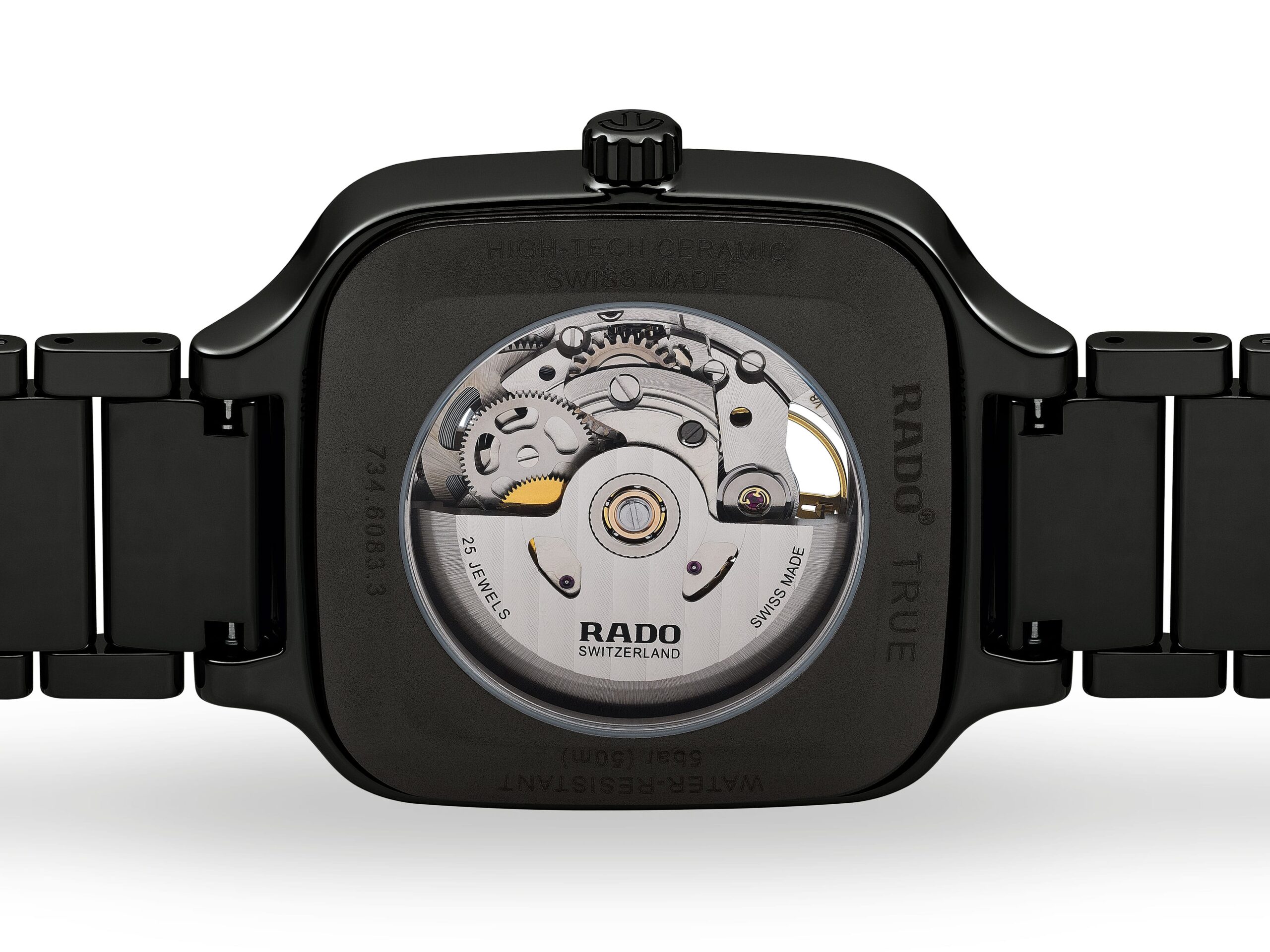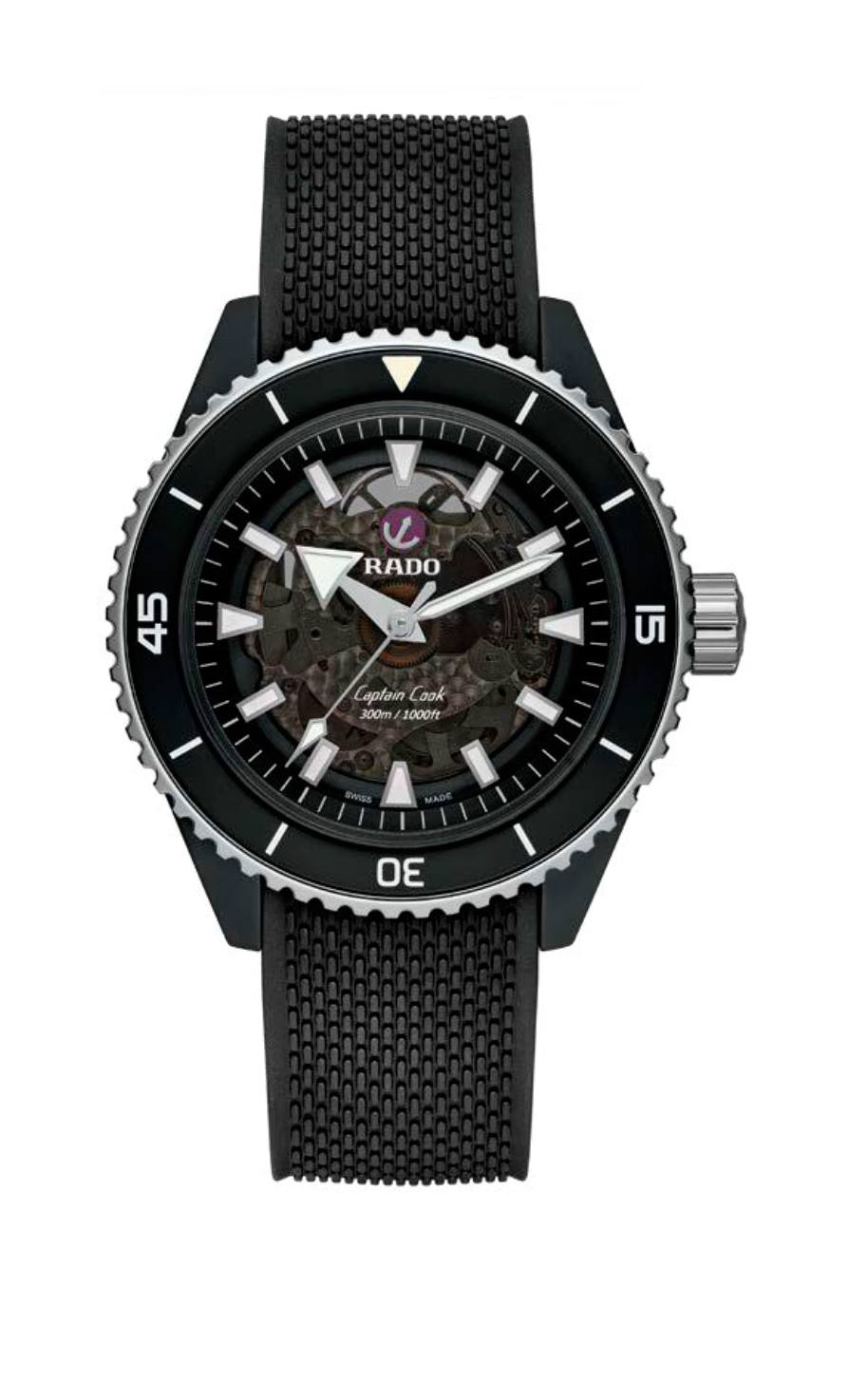 La marca brinda a su reloj de buceo estrella una interesante mezcla entre elementos emblemáticos del pasado y sus tecnologías de vanguardia con el uso de cerámica de alta tecnología. Y hay más en esta colección que solo un material diferente. La principal evolución se refiere a todos los materiales utilizados para la caja. En primer lugar, la carrura es una construcción monobloque y está hecha de cerámica negra mate o plasma mate (la edición gris). Ligera, resistente a los arañazos e hipoalergénica, la cerámica se combina aquí con elementos de contraste para el bisel y la corona, realizados en acero inoxidable con revestimiento de PVD dorado o acero inoxidable endurecido. Como era de esperar, el inserto del bisel todavía está hecho de cerámica negra o azul pulida. El fondo de caja, que tiene una ventana de zafiro teñida de negro, está hecho de titanio cepillado. En comparación con las ediciones de acero o bronce, hay otra actualización notable, y es la carátula y la forma en que está construida. En lugar de una placa de base lisa, Rado ha decidido darle a Captain Cook High-Tech Ceramic un tono translúcido teñido de negro. La carátula de zafiro, que revela parcialmente el movimiento que se encuentra debajo. Si la parte central ahora es de color ahumado, el resto de la carátula (las manecillas, los índices aplicados, la brida interior) son idénticos a las ediciones de acero. Porta el calibre R734, un movimiento automático totalmente robusto, probado y con garantías antimagnéticas y de autonomía excepcionales. La reserva de marcha es de 80 horas, a 3 Hz, porta una espiral Nivachron, que proporciona una ventaja en la vida cotidiana al proteger el reloj de los campos magnéticos.