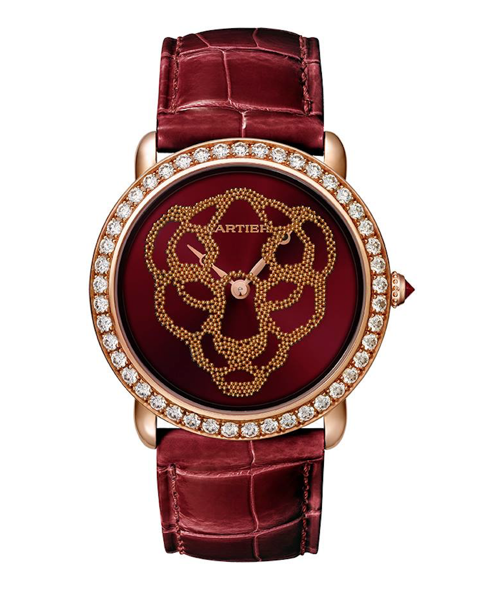 La colección Revelation d´une Panthère de Cartier, está conformada por tres modelos que se diferencian por el tono de sus carátulas y correas. Disponibles con carátula negra, verde o roja y una corona de cuerda engastada con diamante, esmeralda o rubí, estos modelos dejarán ver la magia del felino a través de una caja de oro rosa de 37 mm con hermeticidad de 30 metros y calibre 430 MC.