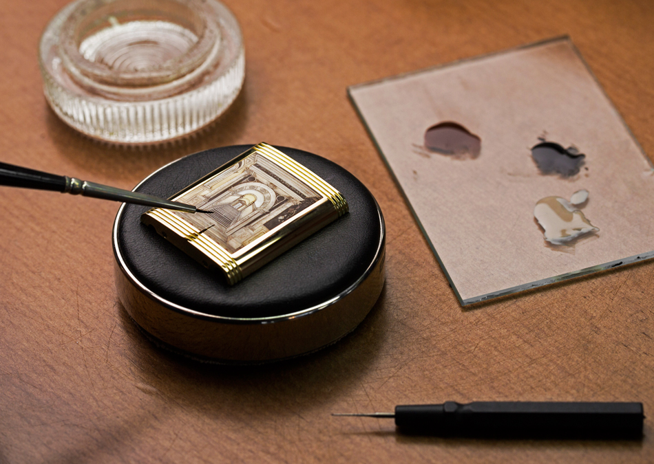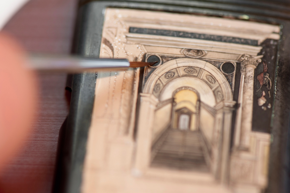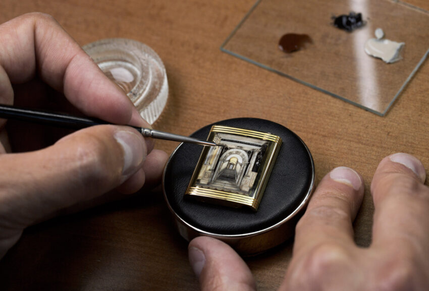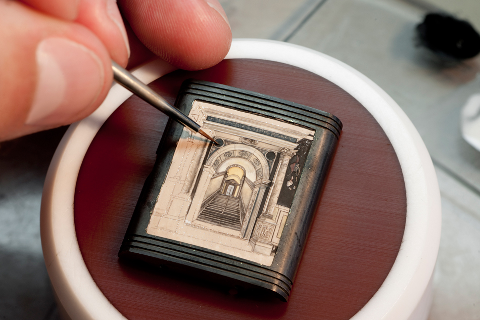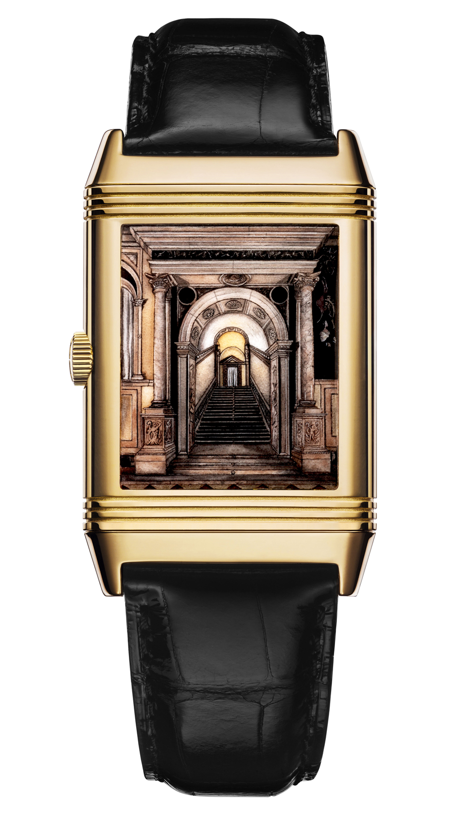 Jaeger-LeCoultre eligió para representar a la escalera principal de mármol de la Scuola Grande di San Rocco que ha sido renovado recientemente gracias al apoyo de la Manufactura. Se tomó cada onza de la maestría de la enamellist transponer en la parte posterior del Diccionario de ver la majestuosa escalera. Solo se utilizaron ciertos colores a fin de respetar la inspiración original para la referencia, además la pieza fue sometida a procesos de horneado y secado en diferentes temperaturas lo cual llevó tres semanas de trabajo.