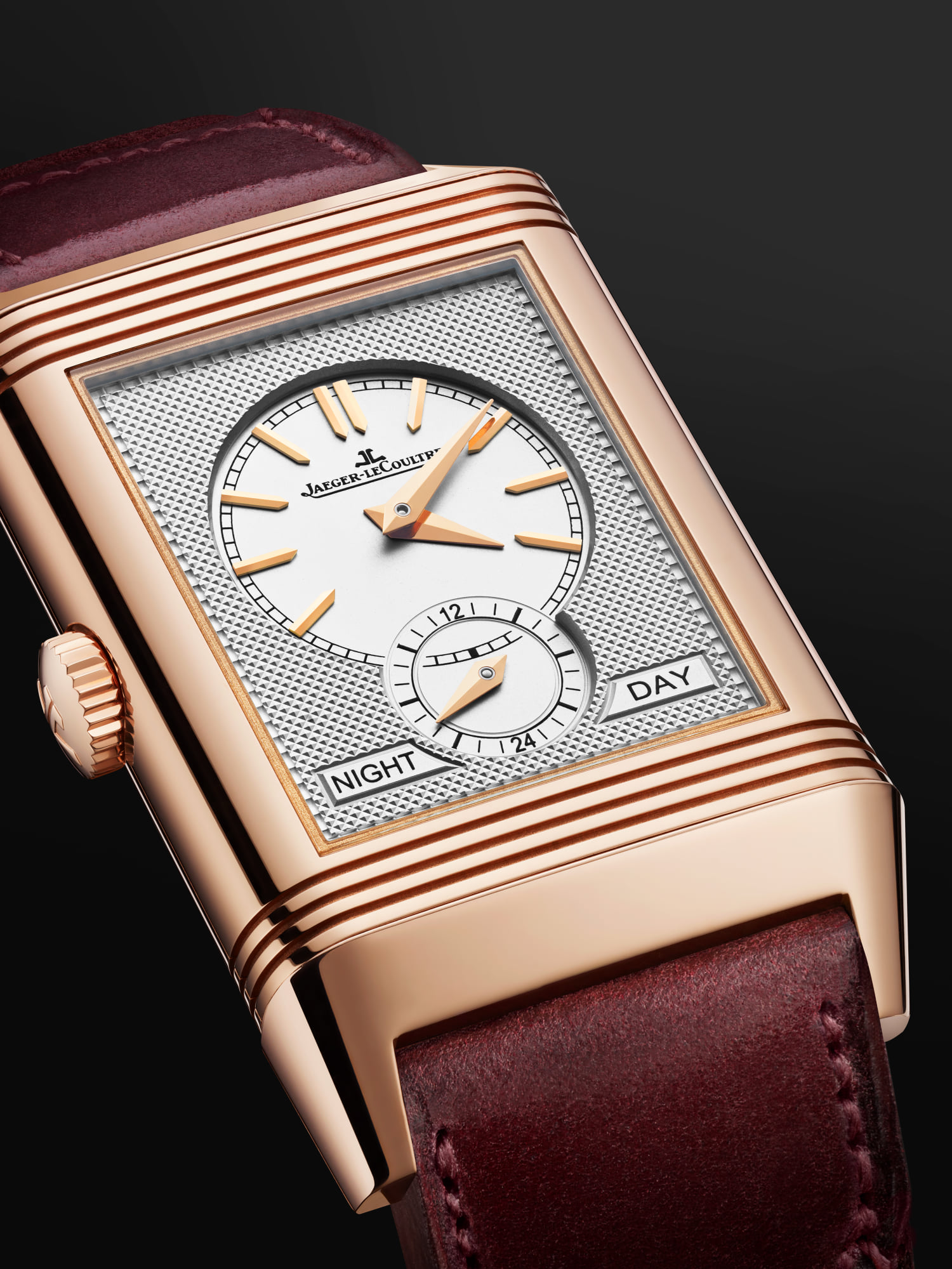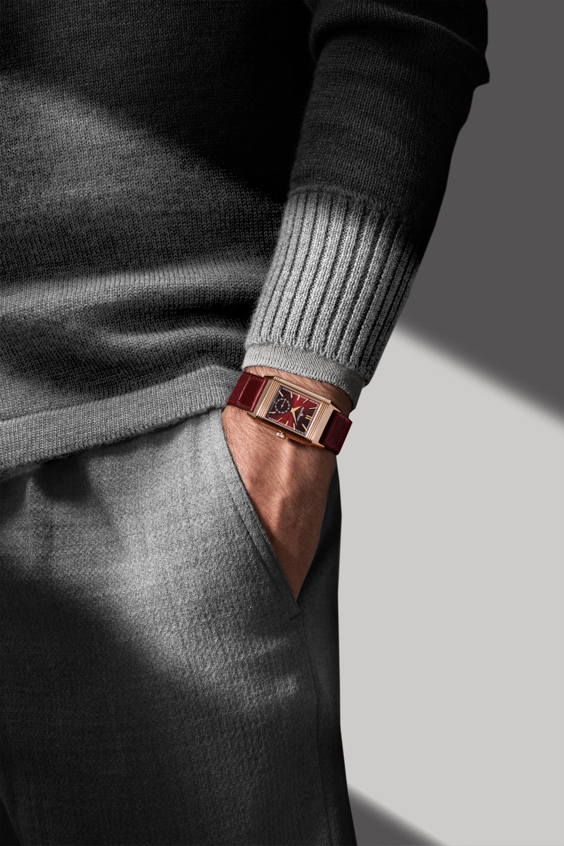 En la carátula frontal, de acuerdo con el diseño original Reverso, las horas están marcadas por índices rectos. Su forma facetada agrega profundidad visual al rico rojo burdeos de la superficie lacada y se hace eco de la forma de las manecillas Dauphine. La pista circular de la pantalla del segundero pequeño a las seis en punto proporciona un contrapunto a la geometría lineal de la carátula y la caja.