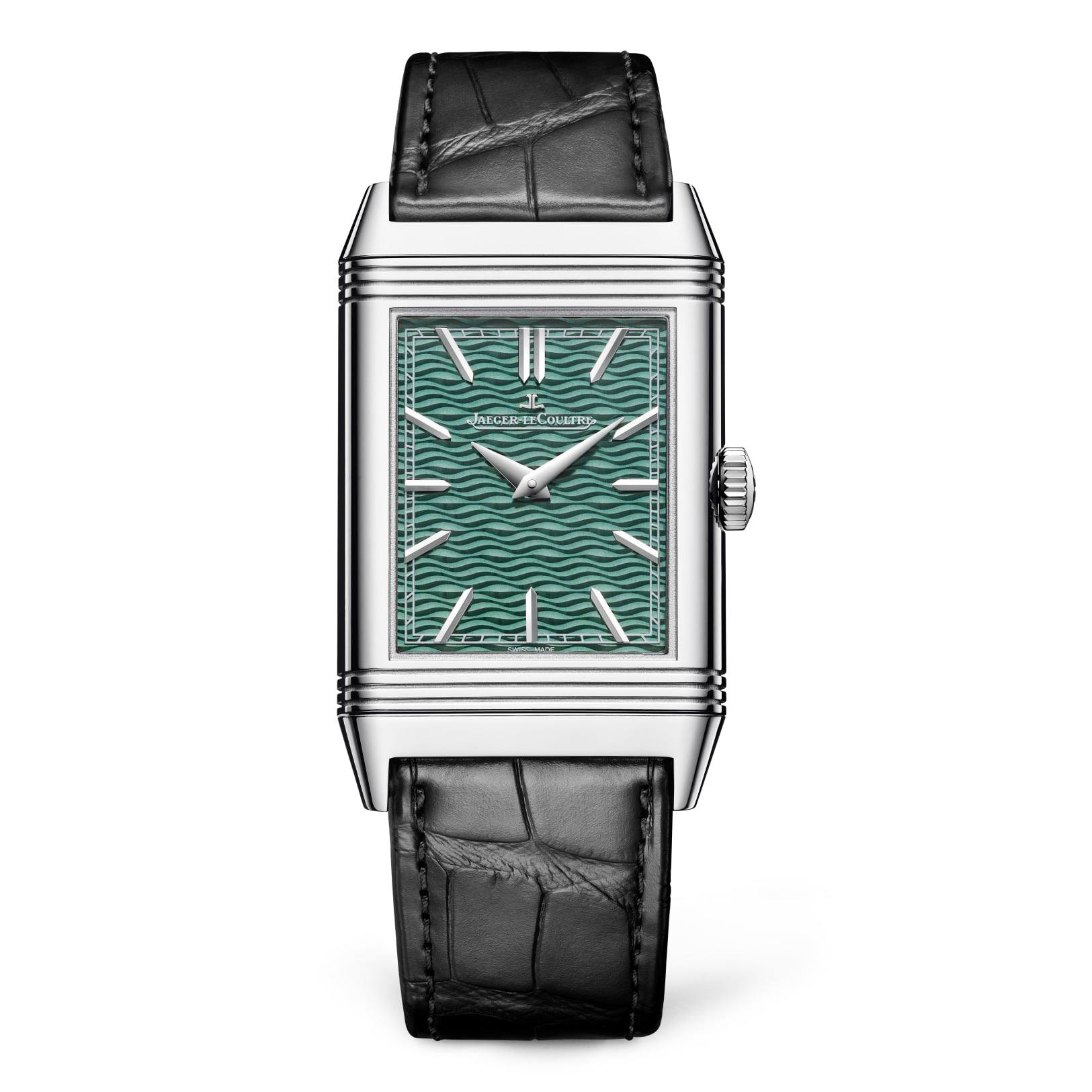 La sencillez de la carátula del Reverso Tribute, con sus índices facetados en aplique y sus agujas Dauphine, pone en valor la belleza de su decoración. Se ha elegido un motivo guilloché ondulado que evoca el movimiento del agua como respuesta artística a la pintura en miniatura del fondo. El efecto visual de las olas, ejecutado a mano con un torno centenario para el que fue necesario crear una leva especial con el fin de lograr este motivo tan particular, se ve reforzado por las capas de esmalte Grand Feu translúcido en un suave tono verde que combina a la perfección con el detalle de la pintura del lado reverso.