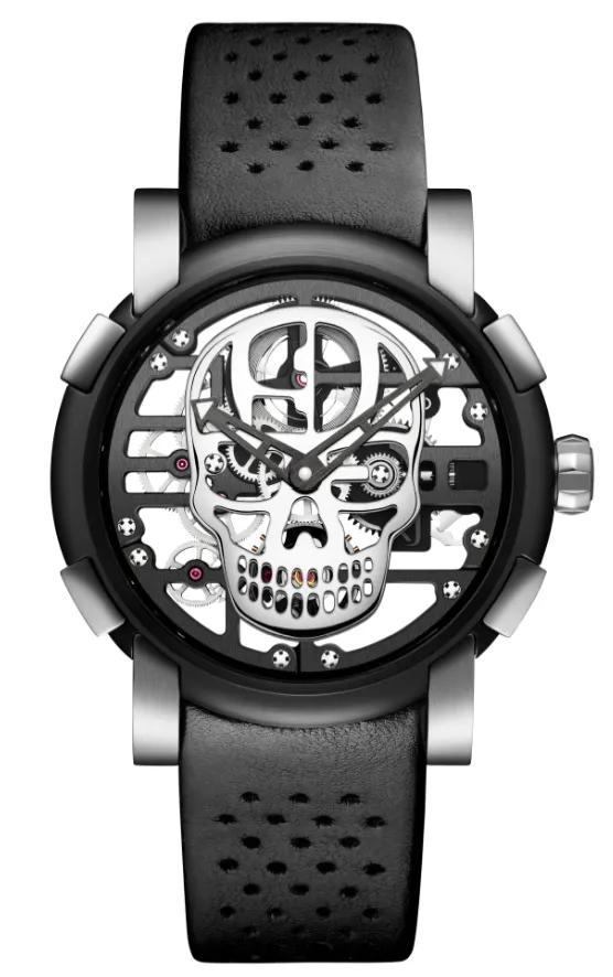 No podía faltar por supuesto la calavera, igualmente esqueletada, que fue aplicada en la carátula con una delicadeza que contrasta con la rudeza de su apariencia. Además, fue pintada a mano en un tono púrpura brindándole un efecto de escamas muy utilizado en el mundo del motociclismo chopper. Por si fuera poco, se utilizó la piel “Guidoline” perforada, empleada en los manubrios de las motocicletas, para crear la correa.