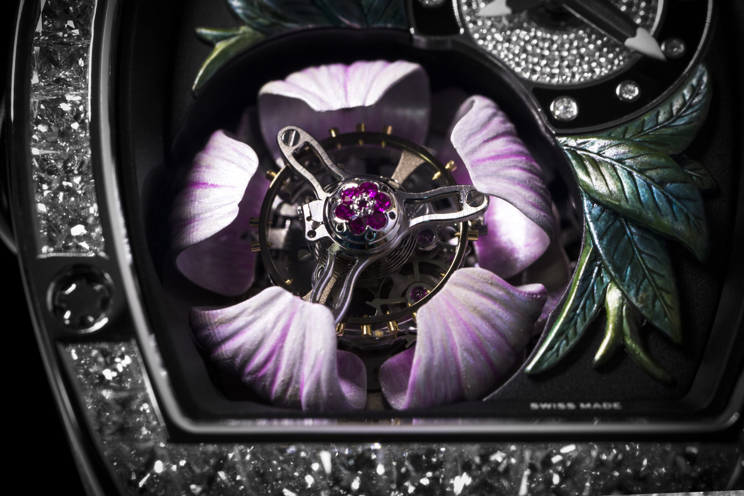 Detrás de este calibre tourbillon de titanio grado 5 hay un mecanismo complejo que comprende cinco palancas que rodean la parte inferior de los pétalos, y otro sistema combinado con inmovilizador largo es usado para elevar el tourbillon volante y el estambre de la flor, todo esto usando energía suministrada por un segundo barrilete separado. Como una mayor atención a los más pequeños detalles, incluso es posible ajustar el ciclo de apertura y cierre.