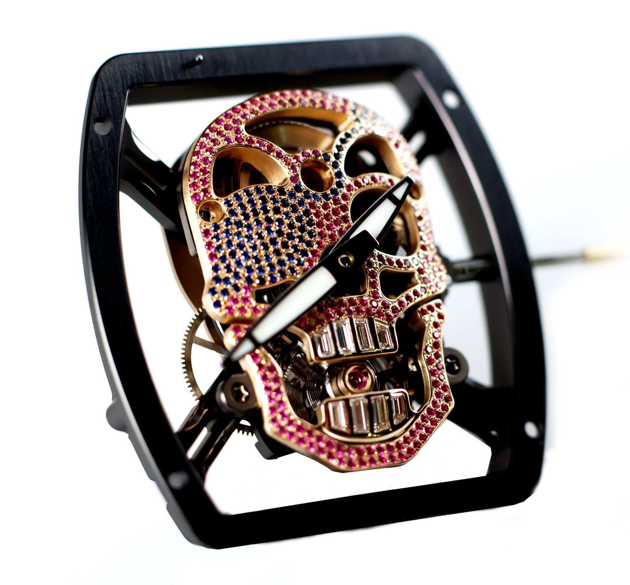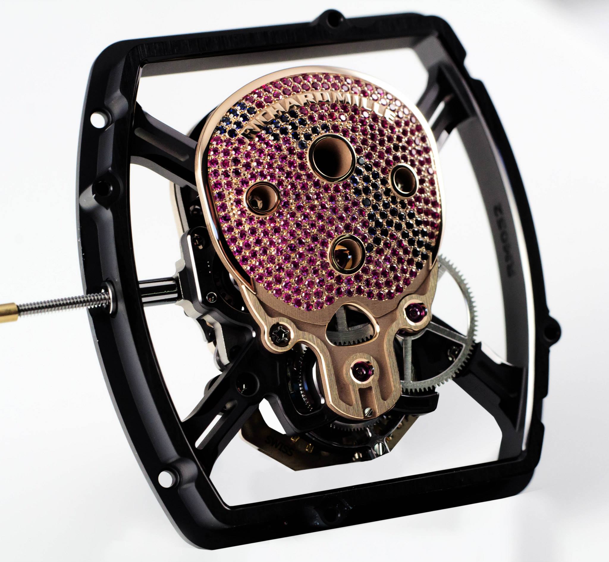 El RM 52-01 Skull Tourbillon está equipado con el calibre de cuerda manual RM052 construido sobre una placa de titanio grado 5 con tratamiento de PVD. El titanio proporciona excelente rigidez y superficies perfectamente planas, y ha sido sometido a una serie de pruebas antes de ser aprobada. Pero ahí es donde las comparaciones con el RM 052 ¡terminan! El cráneo y la parte posterior del cráneo están esculpidas en oro rojo y biselados a mano. Para la caja, Richard Mille ha utilizado un material compuesto sin precedentes conocido como nano-cerámica.