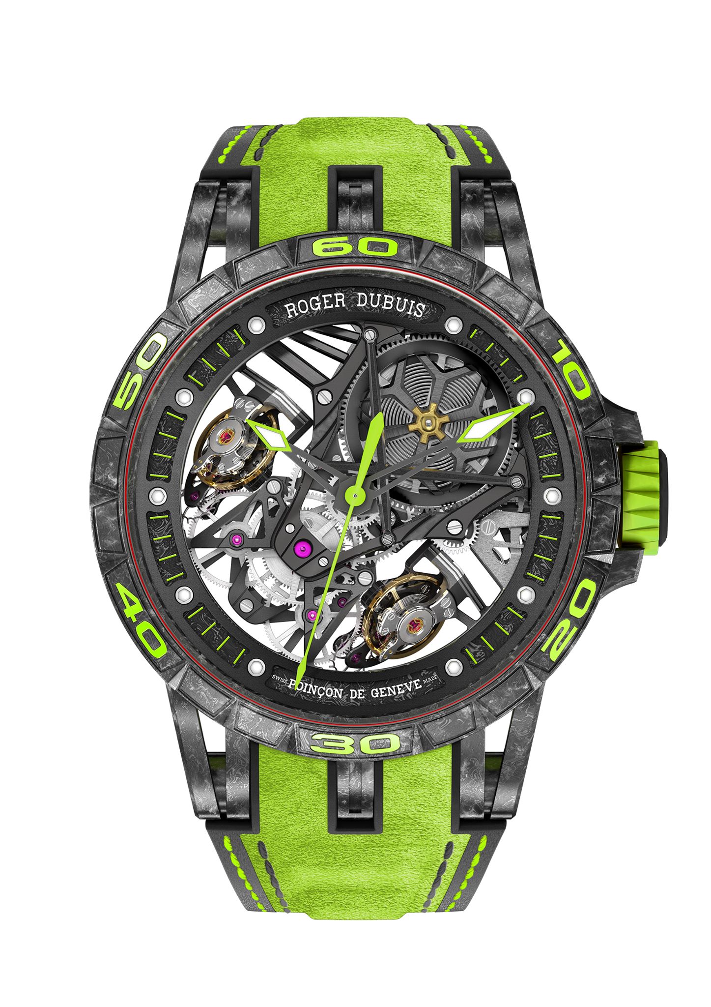 Roger Dubuis ha producido una evolución de su Duotor, reduciéndolo a lo esencial para mejorar su rendimiento. El barrilete, liberado de su puente superior y reformulado en con un volante esqueletizado con forma de las llantas de los neumáticos del Lamborghini Essenza SCV12, puede verse desde la parte superior como si nos asomásemos al cofre de un hiperdeportivo.
