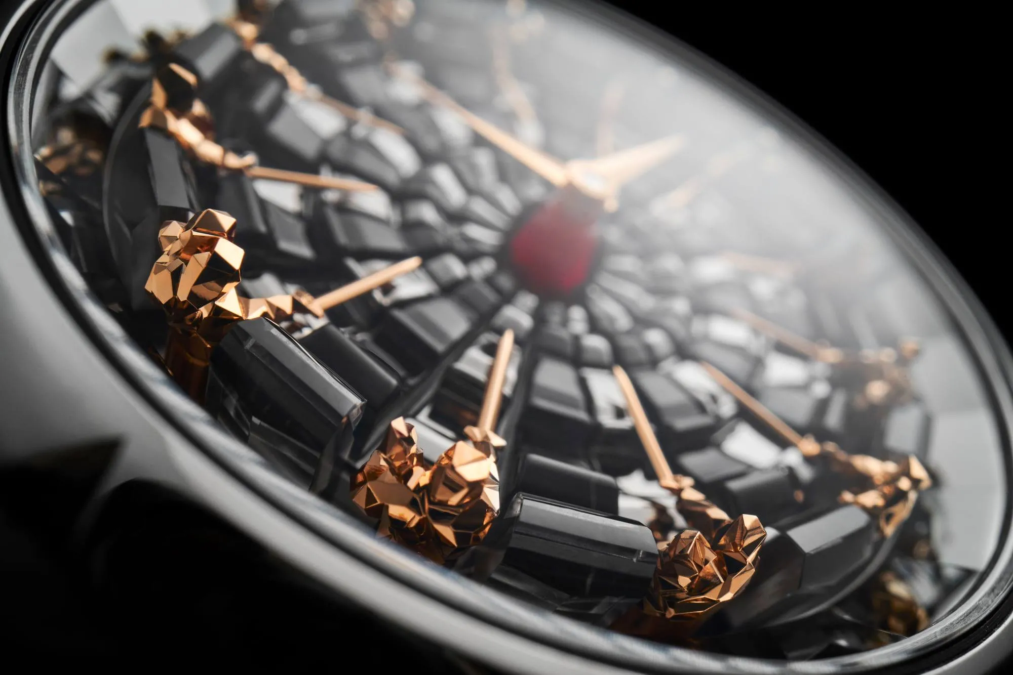 • Carátula: bloque de oro blanco con esmalte gris y cristal Murano; figuras LowPoly esculpidas a mano en oro de 18 quilates