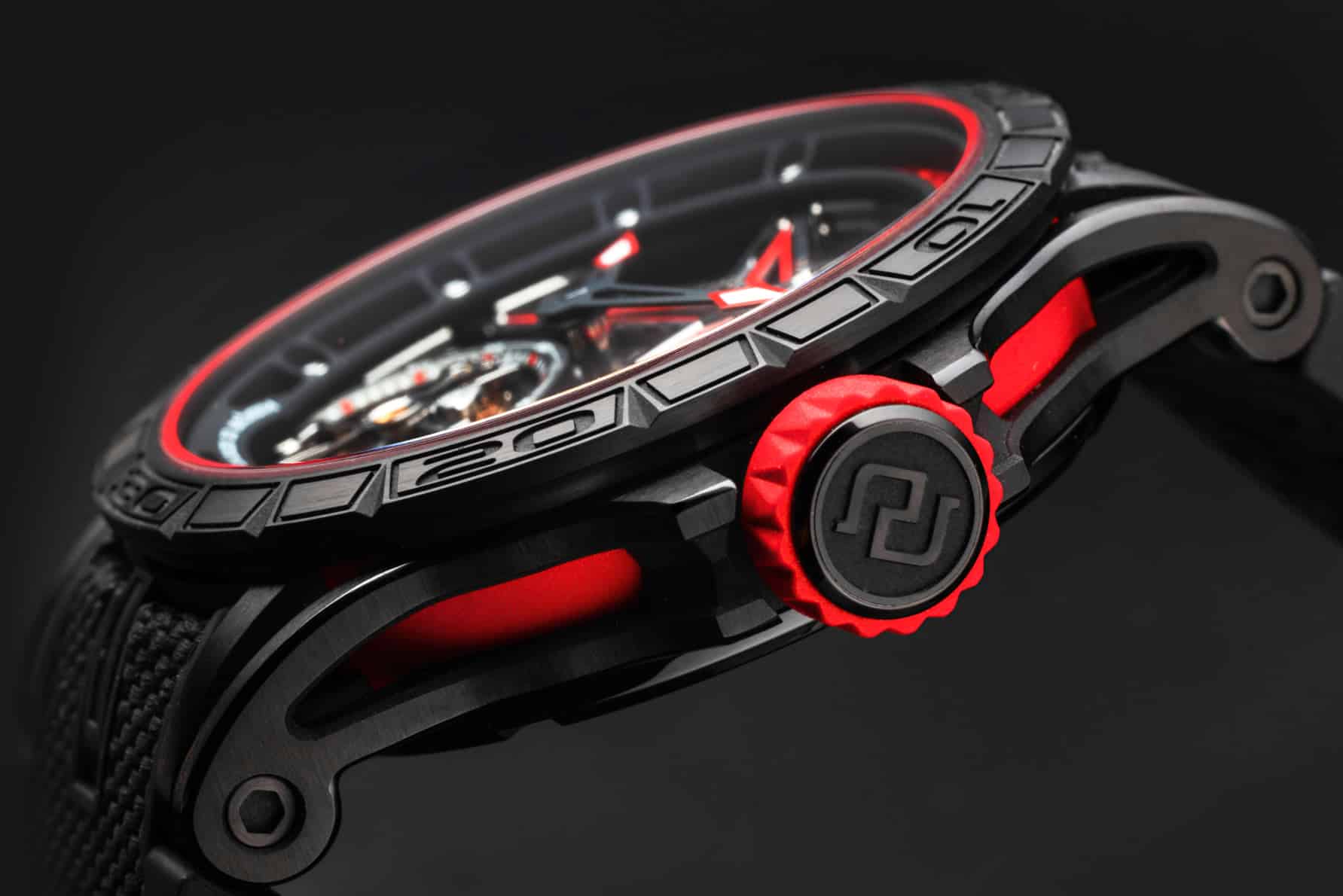 Ya sea en oro rosa con detalles en blanco; titanio total black o en cromática roja con negro, las tres versiones están equipadas con el ingenioso sistema de liberación rápida (intercambio de correas) patentado por Roger Dubuis. Esto permite a disfrutar de la libertad de intercambiar estilos de forma rápida y sencilla.